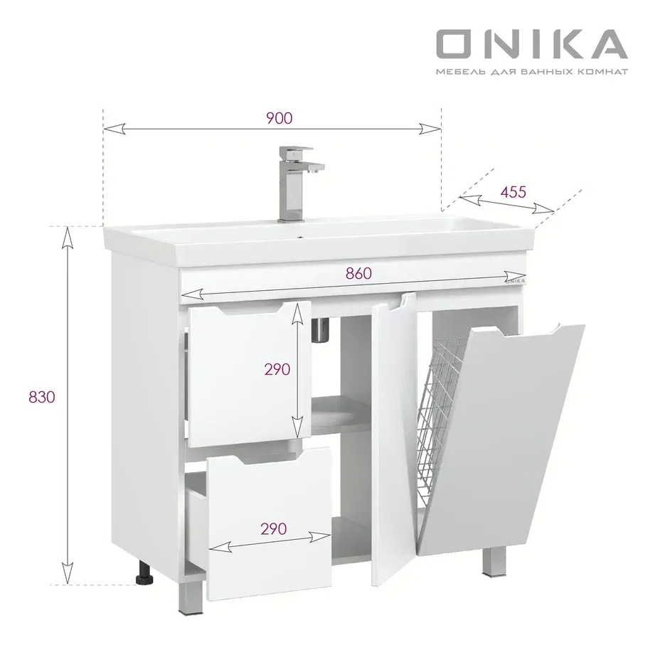 Тумба имеет два ящика с направляющими полного выдвижения, пространство за распашной дверцей с доводчиком и корзину для белья. Ручки, изящно интегрированные в фасады, позволяют сделать эксплуатацию мебели более удобной и практичной.