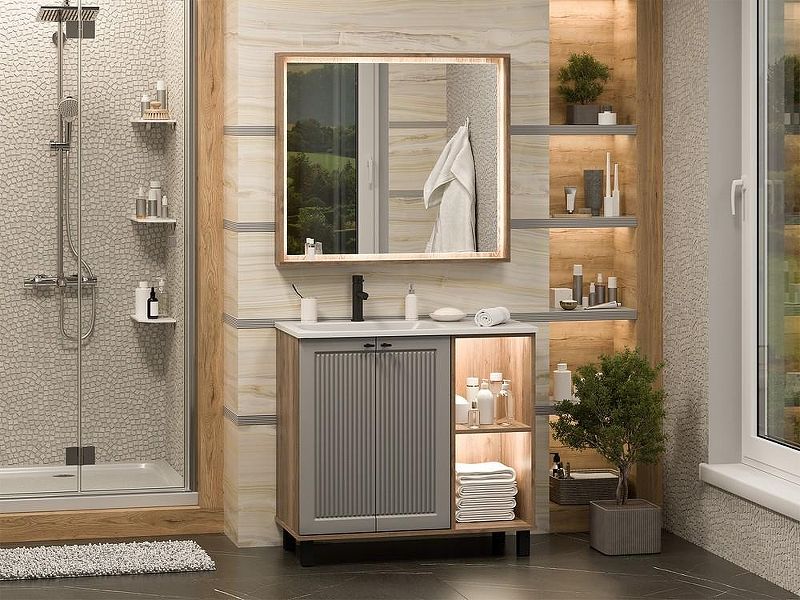 Тумба с раковиной Brevita Lumus 90 L УТ000025489 напольная с подсветкой. Lumus - свет, стиль и практичность. Коллекция Lumus создана для тех, кто ценит современные решения, функциональность и стильные акценты в интерьере. Особенность этой мебели - открытые ниши с подсветкой, которые не только создают уютную атмосферу, но и делают хранение удобнее. Контрастное сочетание оттенков придаёт коллекции выразительность: эмалированные фасады и корпус из ЛДСП идеально дополняют чёрные металлические ручки и регулируемые опоры. Все элементы продуманы до мелочей: петли с доводчиками гарантируют плавное закрывание дверей, а премиальные материалы обеспечивают долговечность и надёжность. Это мебель, которая смотрится эффектно в любом интерьере, подчёркивая внимание к деталям. Lumus - это больше, чем просто мебель. Это игра света и тени, стиль, который привлекает внимание, и комфорт, который ощущаешь каждый день. Характеристики: Тумба под раковину:
