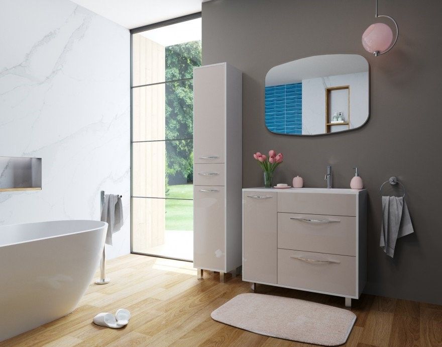 Коллекция Barcelona выполнена в стиле модерн. Плавные линии и формы подчеркивают элегантность комплекта, а разнообразие комплектации позволяет использовать мебель в качестве маркера вашего собственного стиля. За счет раковины с крылом коллекция Barcelona более вместительная и удобная. В подвесной тумбе располагаются 3 ящика и дополнительное пространство с распашной дверцей. Два ящика предполагают размещение более крупных вещей, а один ящик для мелких предметов. В секции с распашной дверцей можно разместить бытовую химиюТумба белого цвета по умолчанию. Возможна покраска по палитре RAL.