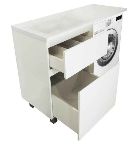 Коллекция мебели для ванной комнаты Dallas Luxe покоряет своей удивительной простой и функциональностью. Стильная лаконичная тумба, укомплектована раковиной из литьевого мрамора с удобной чашей. Стиральная машина устанавливается под столешницей, за счет чего экономит место в ванной комнате. В тумбе имеются два ящика. Нижний ящик тумбы – широкий и вместительный – предназначен для крупных предметов, а в верхнем имеется специальная организация пространства, позволяющая хранить мелкие вещи.