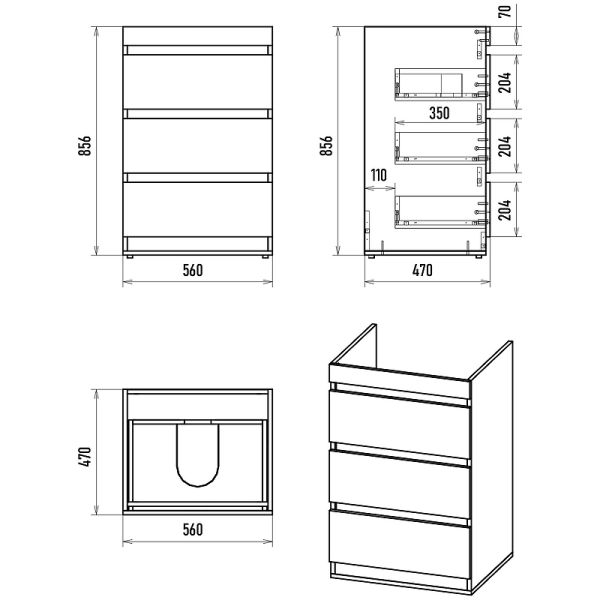 Габариты корпуса тумбы (ШхВхГ): 560х856х470 мм.