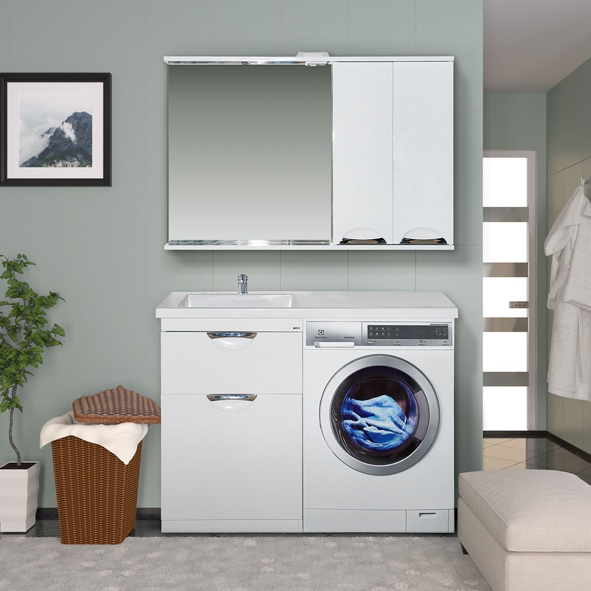 Напольная тумба под раковину Misty Куба под стиральную машину 60см с бельевой корзиной белый