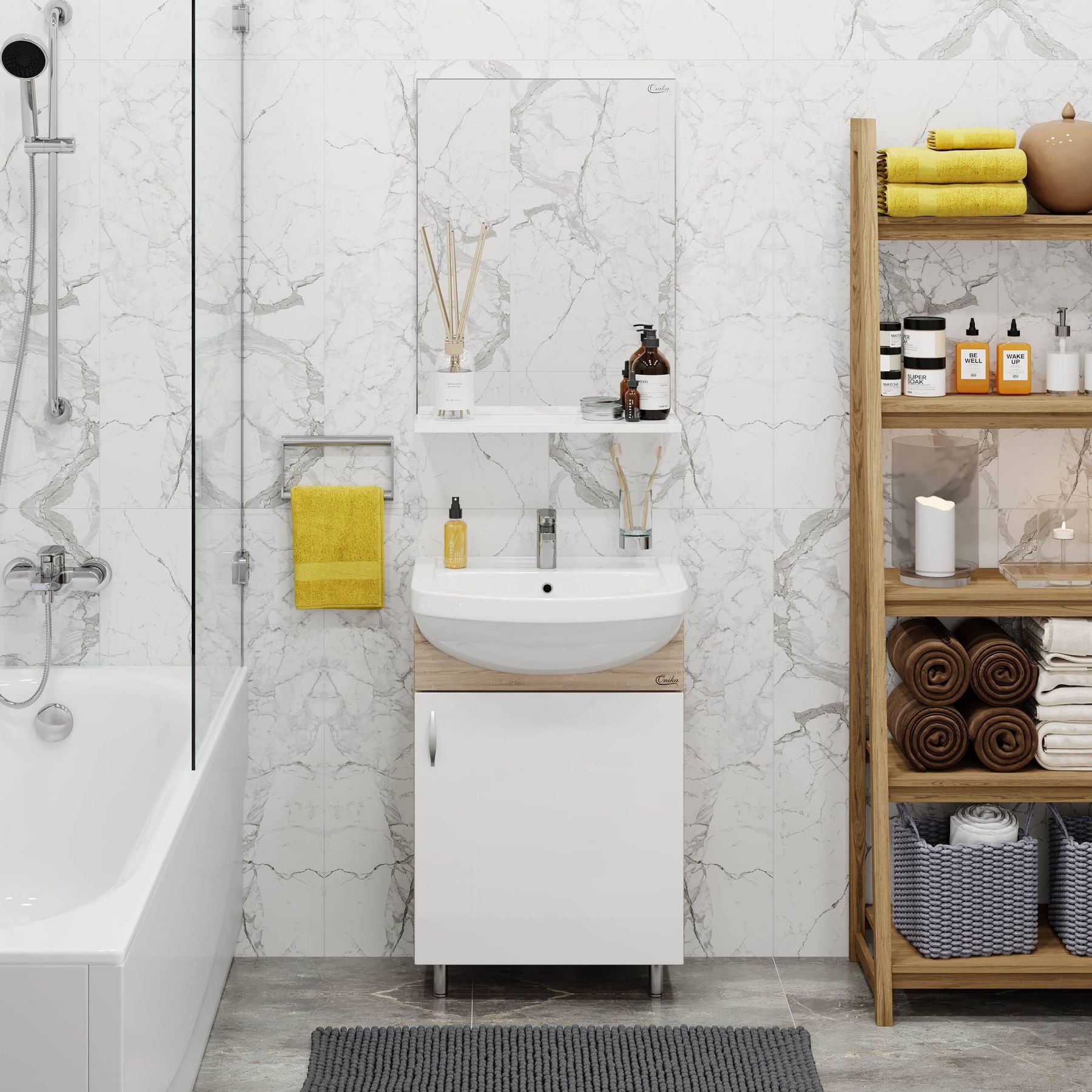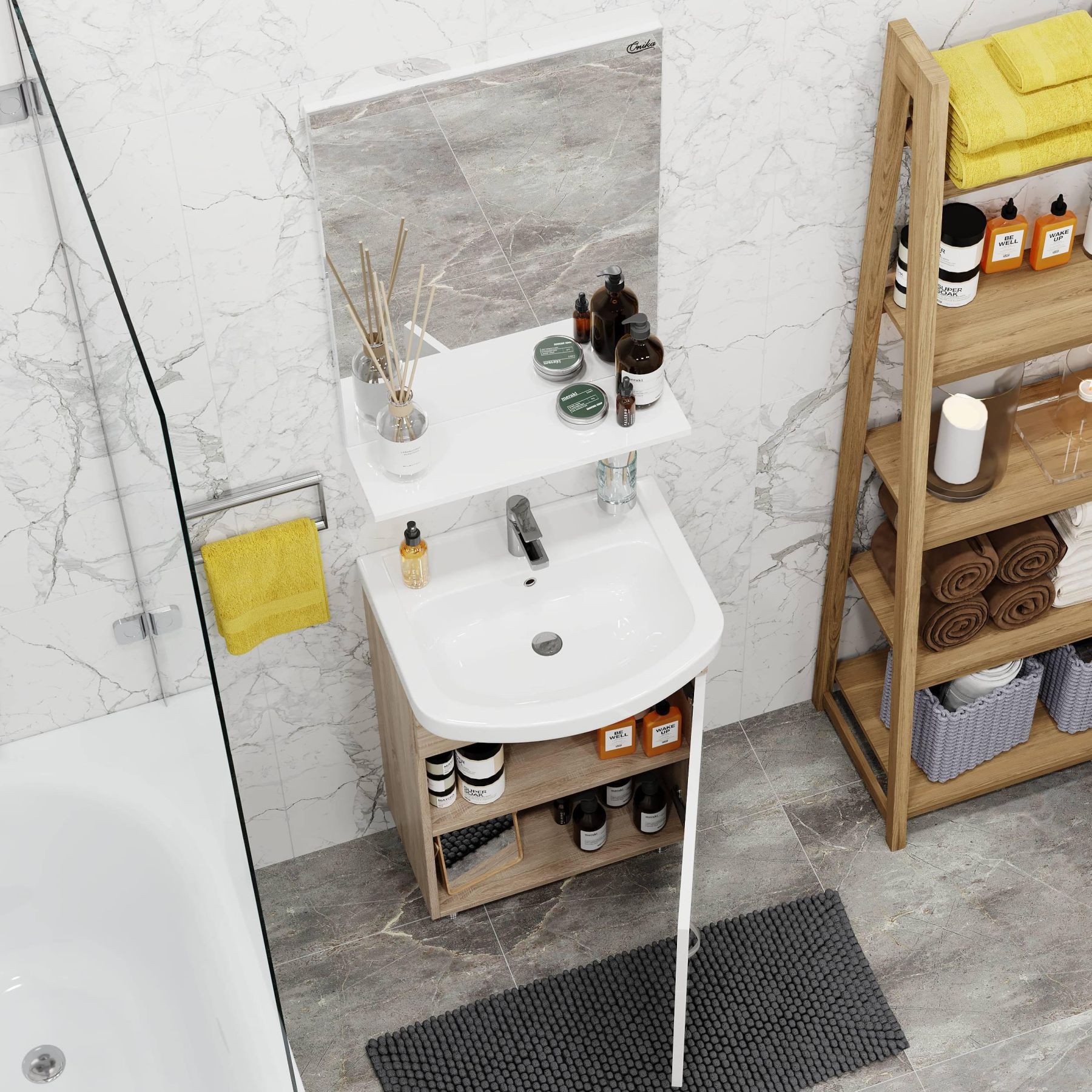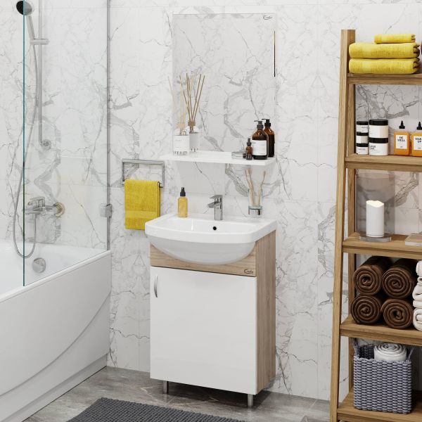 Компактные габариты позволяют грамотно организовать небольшой санузел, а белый фасад и корпус цвета дуба с роскошной текстурой гармонично впишется в интерьер любой ванной комнаты.