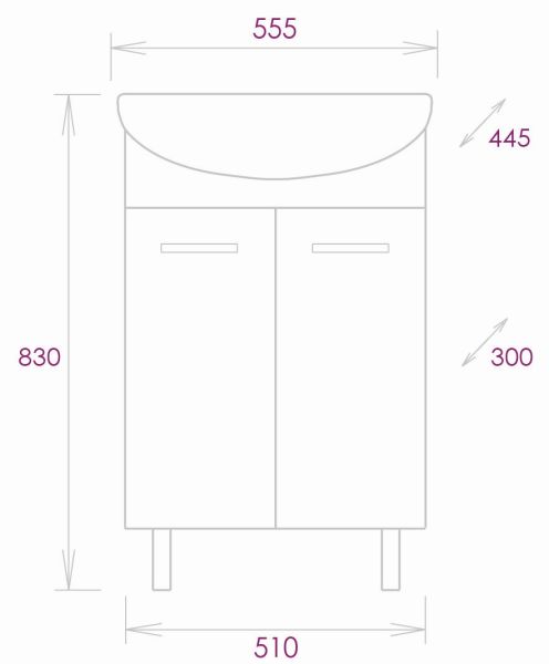 Размеры тумбы без учета раковины и ножек: 51х30х68см.