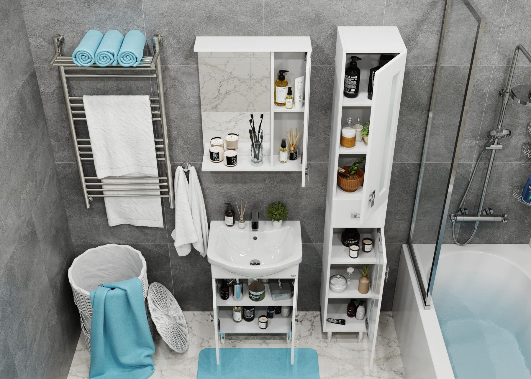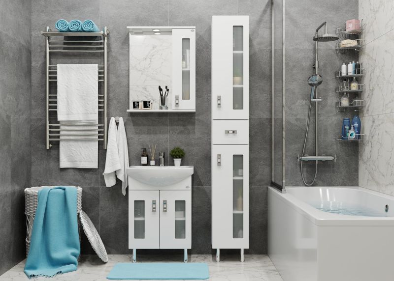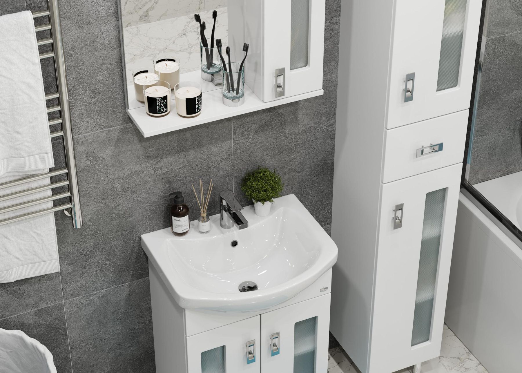 Белоснежный глянцевый цвет фасада в сочетании со вставками из матового стекла и хромированными ручками необычной формы придадут ванной комнате ощущение свежести, чистоты и уюта.