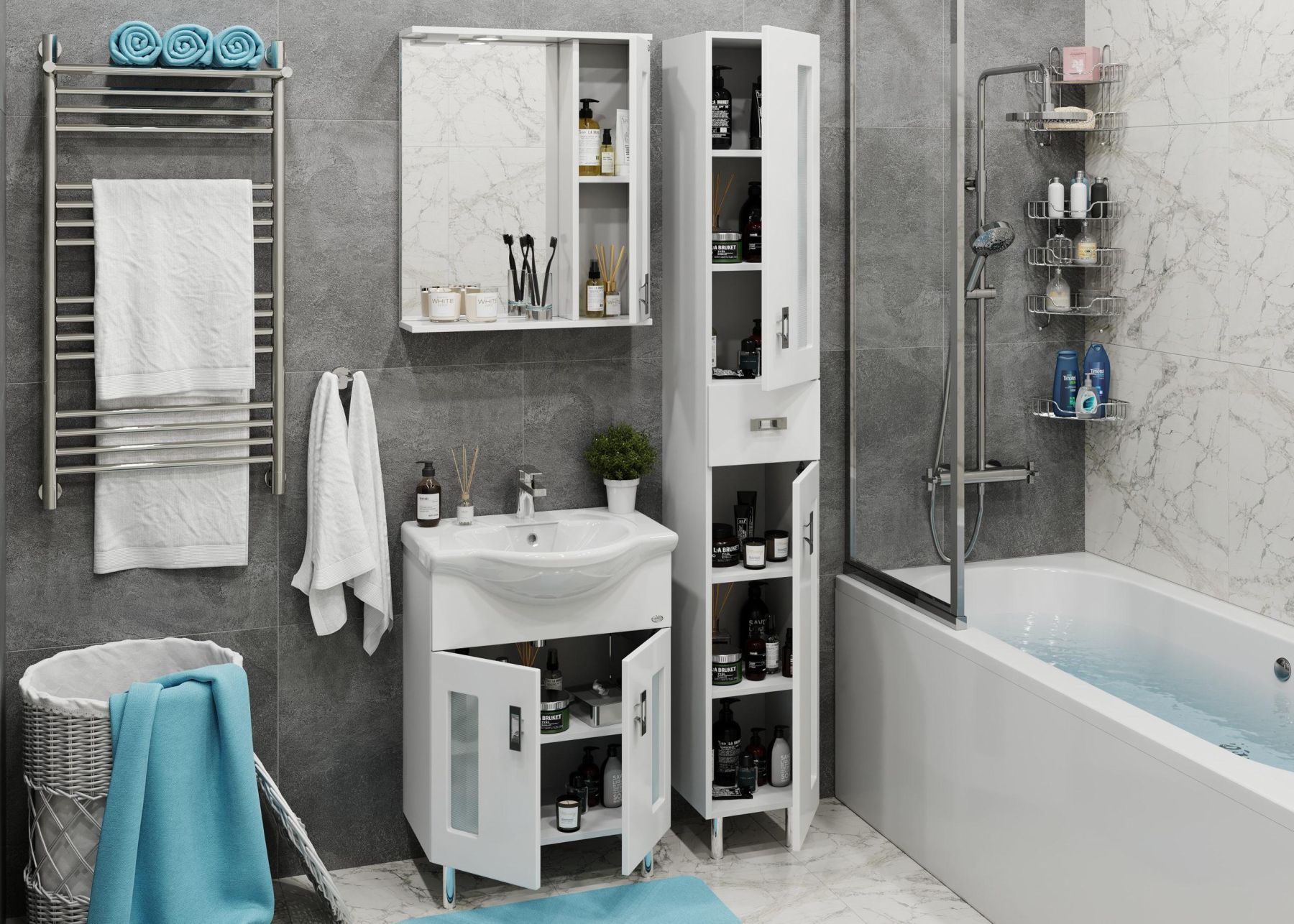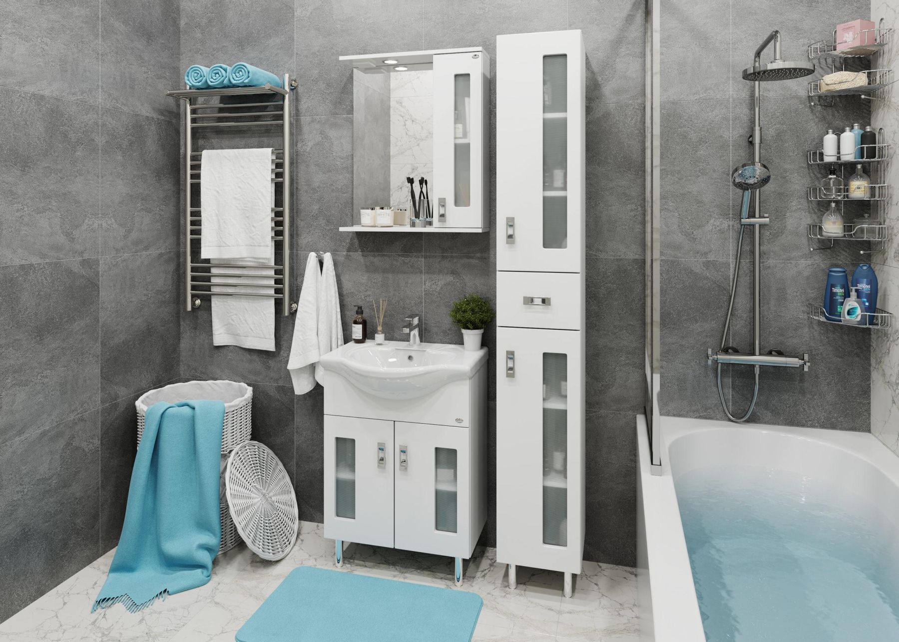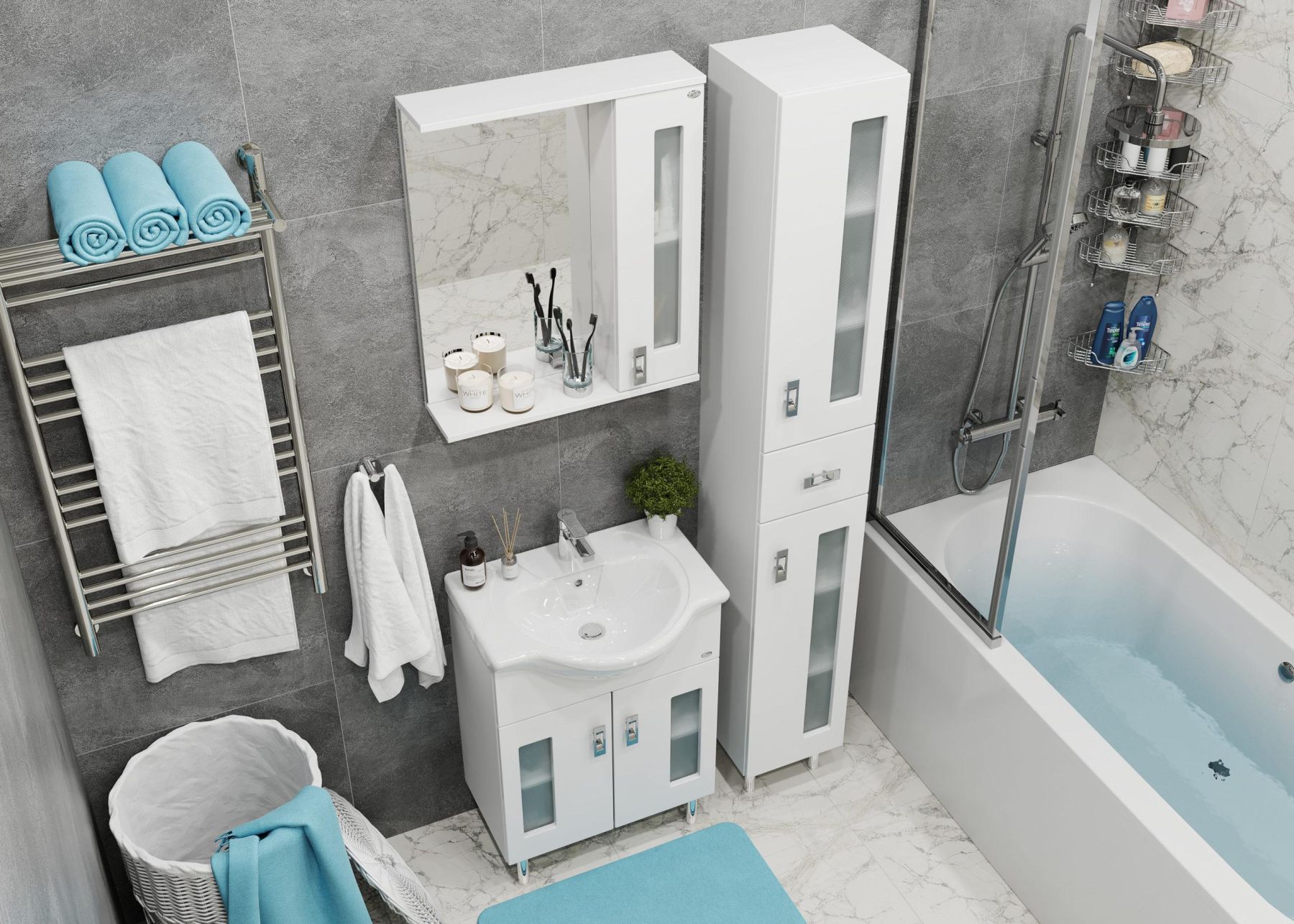 Белоснежный глянцевый цвет фасада в сочетании со вставками из матового стекла и хромированными ручками необычной формы придадут ванной комнате ощущение свежести, чистоты и уюта.