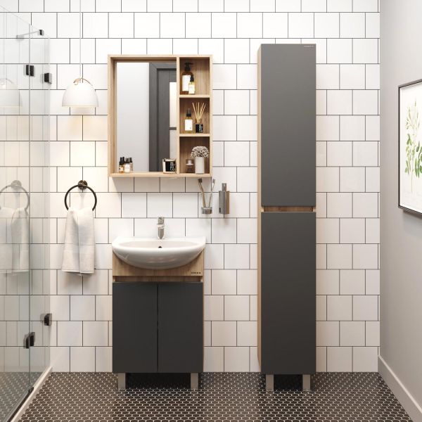 Тумба сочетает в себе красоту и функциональность: серый матовый фасад с покрытием SoftTouch, корпус цвета дуб сонома с роскошной текстурой, строгие формы без декора. За дверцей с интегрированной ручкой скрывается пространство с полкой для размещения необходимых бытовых принадлежностей.