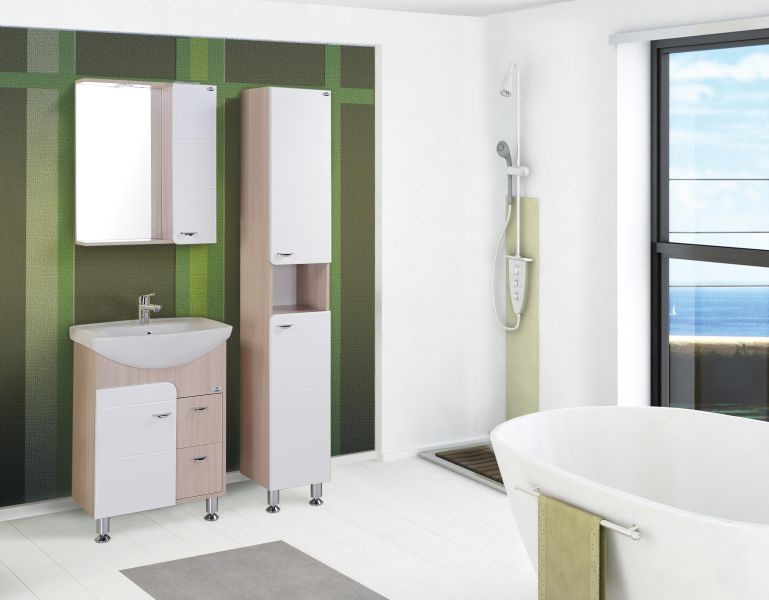 В оригинальной напольной тумбе Onika Стиль 60 удачно сочетаются контрастные цвета и фактуры: белый глянец на фоне светлого натурального дерева очень эффектно смотрится практически в любых интерьерах ванной комнаты.