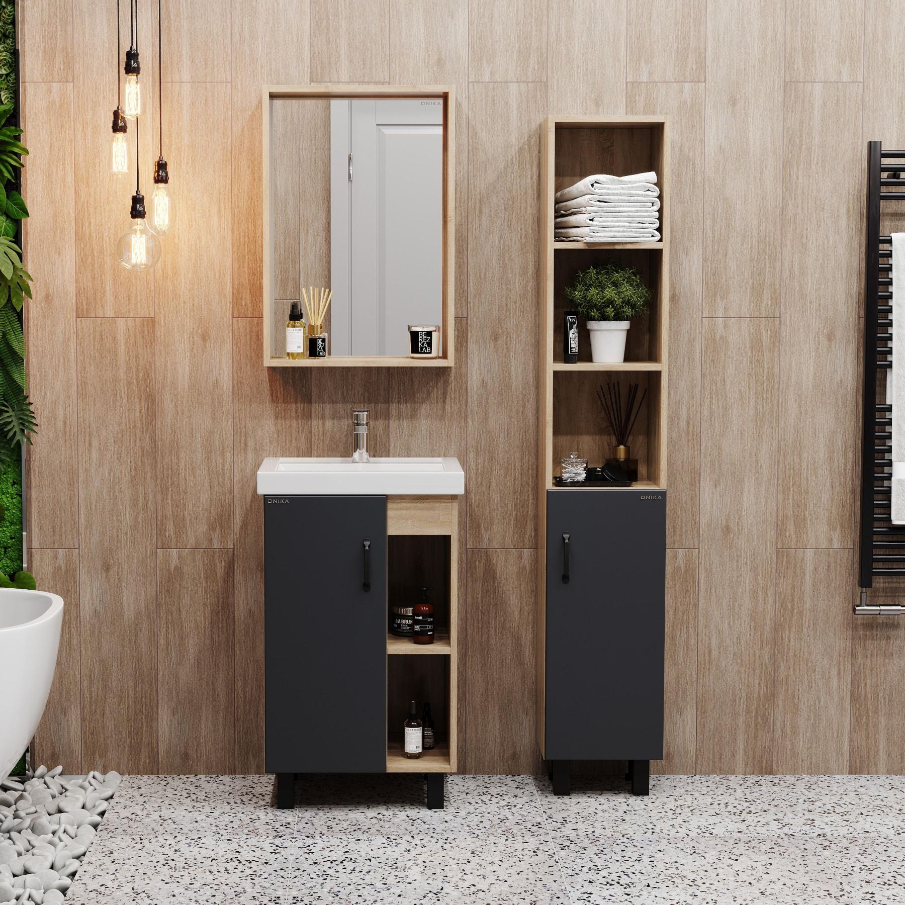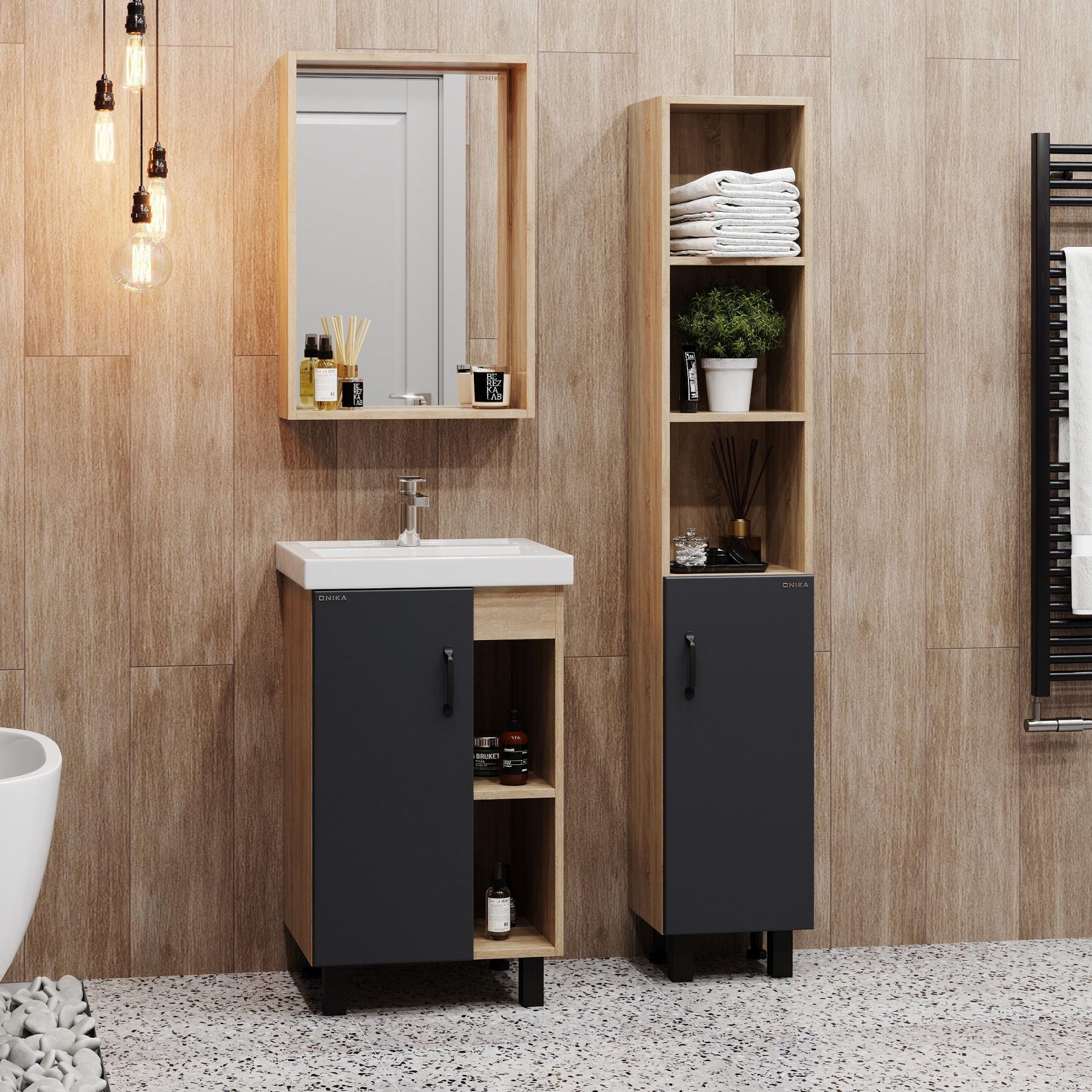 В тумбе Onika Тимбер 50 удачно сочетаются контрастные цвета и фактуры: серый матовый фасад с покрытием SoftTouch, корпус цвета дуба с роскошной текстурой, черная матовая металлическая фурнитура.