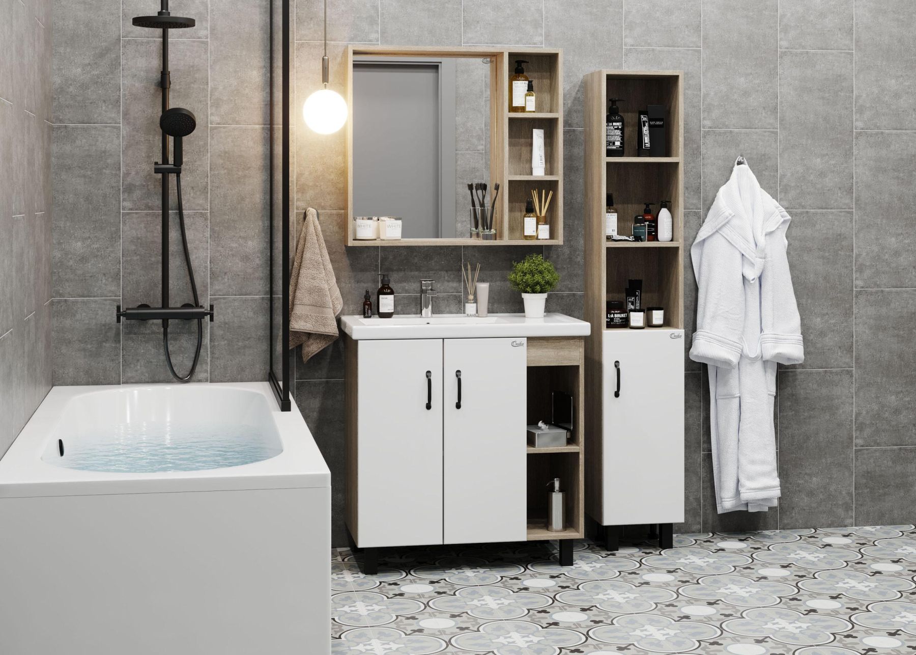 В тумбе Onika Тимбер 80 удачно сочетаются контрастные цвета и фактуры: белый матовый фасад с покрытием SoftTouch, корпус цвета дуба с роскошной текстурой, черная матовая металлическая фурнитура.