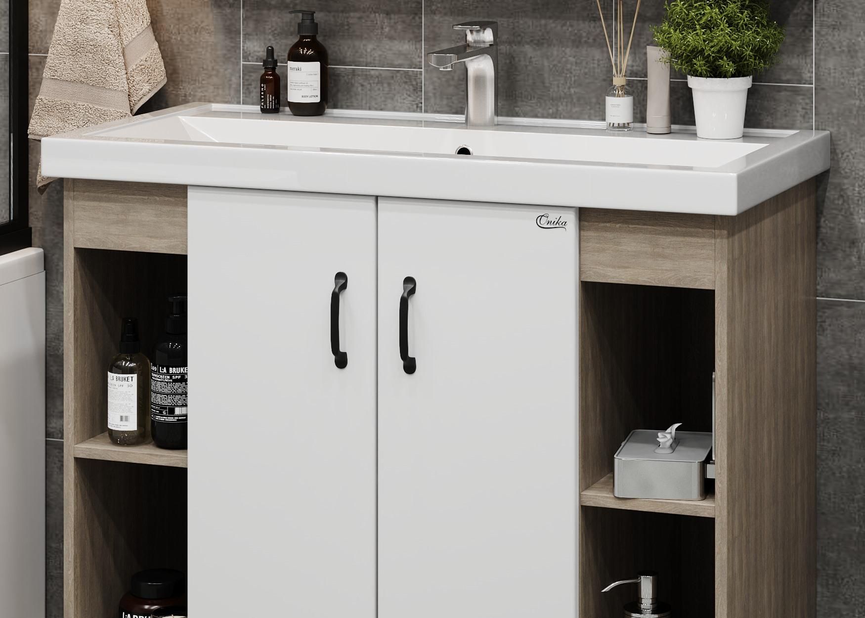 В тумбе Onika Тимбер 100 удачно сочетаются контрастные цвета и фактуры: белый матовый фасад с покрытием SoftTouch, корпус цвета дуба с роскошной текстурой, черная матовая металлическая фурнитура.