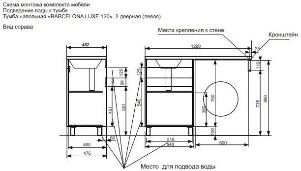 Тумба укомплектована раковиной из литьевого мрамора c глубокой чашей, плавными изгибами и вкладышем для слива. Раковина с большой столешницей удобная и функциональная. В тумбе 2 распашных дверцы со скрытыми ручками и полкой внутри, что делает использование максимально комфортным. Стиральная машина устанавливается под столешницей, за счет чего экономит место в ванной комнате.