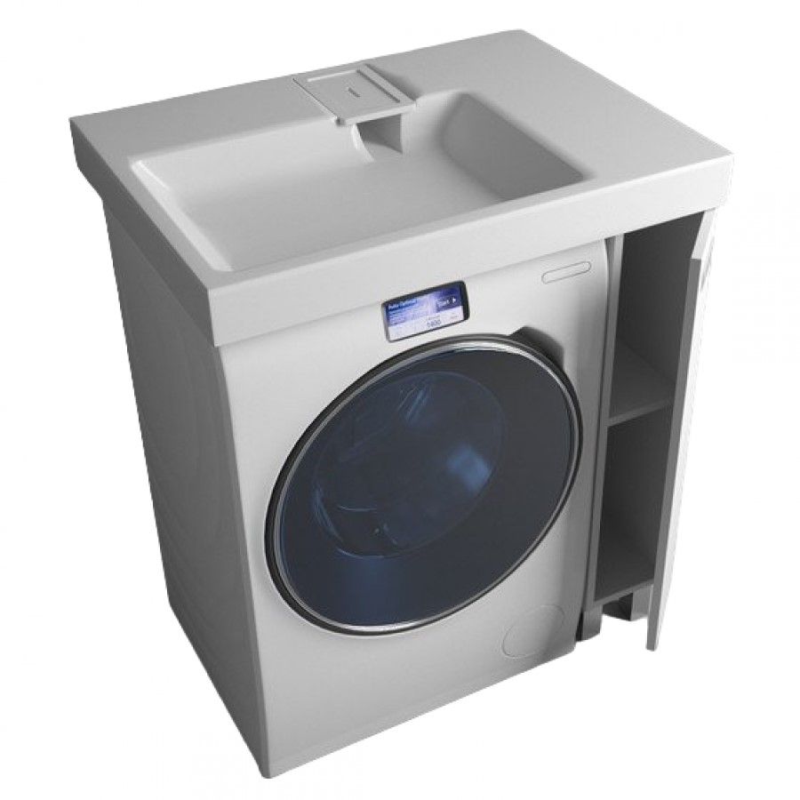 Простые и четкие линии тумбы идеально впишутся в интерьер в стиле «минимализм», а компактная раковина из литьевого мрамора установленная над стиральной машиной, позволяет сэкономить место в ванной комнате.