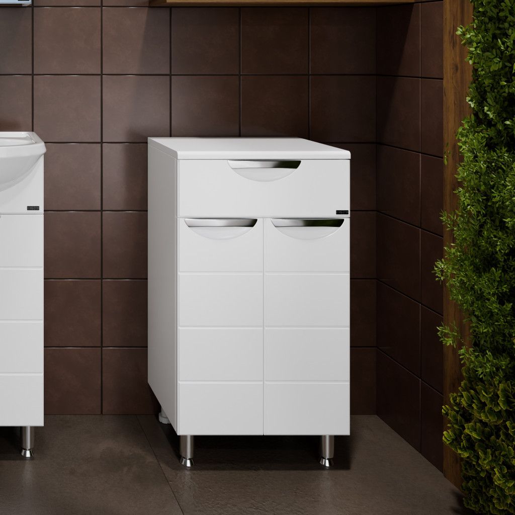 Комплектация: Ручка хром - 3, выдвижной ящик - 1, на дверках петли плавного закрывания, ножка хром - 2, ножка пластик - 2 Тумба напольная СаНта Родос 45 с 1 ящиком напольная предназначена для хранения различных мелочей в ванной комнате. Комод в ванную комнату изготовлен из влагостойких материалов, фасад и столешница комода для ванны изготовлена из МДФ, корпус из влагостойкого ЛДСП. Комод для ванной комнаты оснащен ящиком полного выдвижения (без плавного закрывания). Ножки у комода для ванны идут в комплекте. Купить комод для ванной комнаты вы можете оформив заказ у нас на сайте. Также вы можете подобрать к комоду тумбу с раковиной из коллекции Родос.
