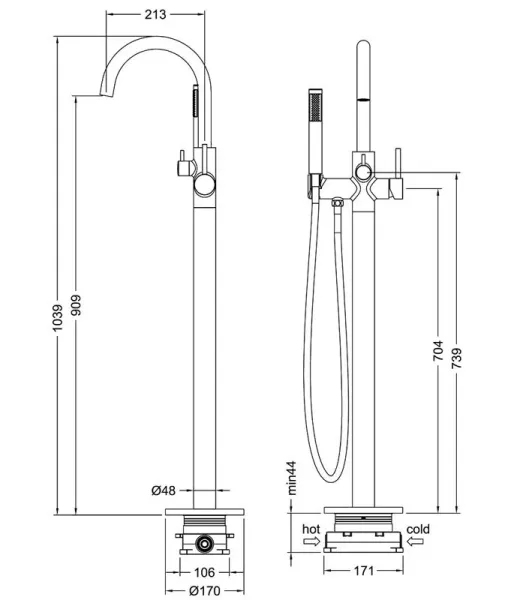 - Напольный смеситель для ванны с душевым гарнитуром