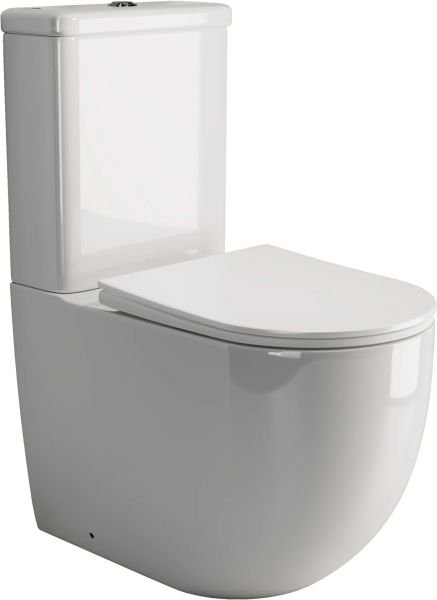 Напольный пристенный унитаз с бачком Mia Rimless, двойной смыв 3/6, нижняя подводка глубокий смыв, горизонтальный (универсальный) выпуск, с крепежом, ультра тонким сидением с функцией плавного закрытия, дюропласт