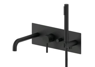 Смеситель для ванны встраиваемый на 2 выхода, накладка из нерж стали 350х120мм, душ гарнитур MASTER из металла, девиатор-кнопка, Черный матовыйСмеситель для ванны с душем Paffoni Light LIG001NO (с внутренней частью) предназначен для ванны с душем. Своим лаконичным дизайном и колористикой он внесет в интерьер помещения особое настроение, подчеркнув его своеобразие. Он выполнен из надежного материала латунь, нержавеющая сталь, который не ржавеет, а потому прослужит без ремонтов. Изделие является оптимальным примером достойного качества. Управление в смесителе предусмотрено однорычажное, что отвечает пожеланиям любителей такого типа смесителей. Высокую работоспособность и основательность смесителю гарантирует керамический картридж, безусловным плюсом которого является продуманная конструкция - залог бесперебойной работы в течение продолжительного времени. Не зря гарантия на смеситель – 5 лет, в течение которого компания Paffoni заверяет в его бесперебойной работе. Форма излива в смесителе - традиционная, а тип - фиксированный. При покупке учтите, что подводка у смесителя жесткая, что важно для его подключения.