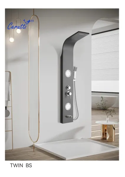 Комфорт ванной комнаты формируется современными элементами обустройства помещения. Поэтому для создания уютной атмосферы необходимо внимательно отнестись к выбору сантехнического оборудования. Сделать вашу ванную комнату не только эргономичной, но и функциональной, поможет душевая панель.Душевые панели становятся все более популярными, так как предлагают роскошные SPA процедуры в комфорте вашей собственной ванной комнаты. Эти изящные и стильные устройства обладают целым рядом функций, которые призваны улучшить ваши впечатления от принятия душа.Также душевые панели являются отличным решением для помещений любых размеров: они компактные, функциональные, удобные в управлении и эксплуатации. Душевые панели не требуют трудоёмкого ухода и являются отличной альтернативой классическим смесителям с ручной лейкой, душевым стойкам или кабины с гидромассажем.Трендовые душевые панели бренда Ceruttispa отличаются высоким качеством, современным дизайном, многофункциональностью, надежностью и долговечностью. Они будут прекрасно смотреться в любом интерьере, а качественный материал исполнения - нержавеющая сталь - прослужит долго, сохранив свои эстетические характеристики. Удобная и многофункциональная душевая панель TWIN BS предназначена для установки внутри душевых уголков, ограждений, а также совместно с ванной.Конструкция панели включает в себя верхний и ручной душ, а также держатель для аксессуаров. Излив оснащен аэратором, который снижает расход воды легко очищается.Внимание! Производитель оставляет за собой право вносить изменения в конструкцию и комплектацию моделей без предварительного уведомления!Особенности: