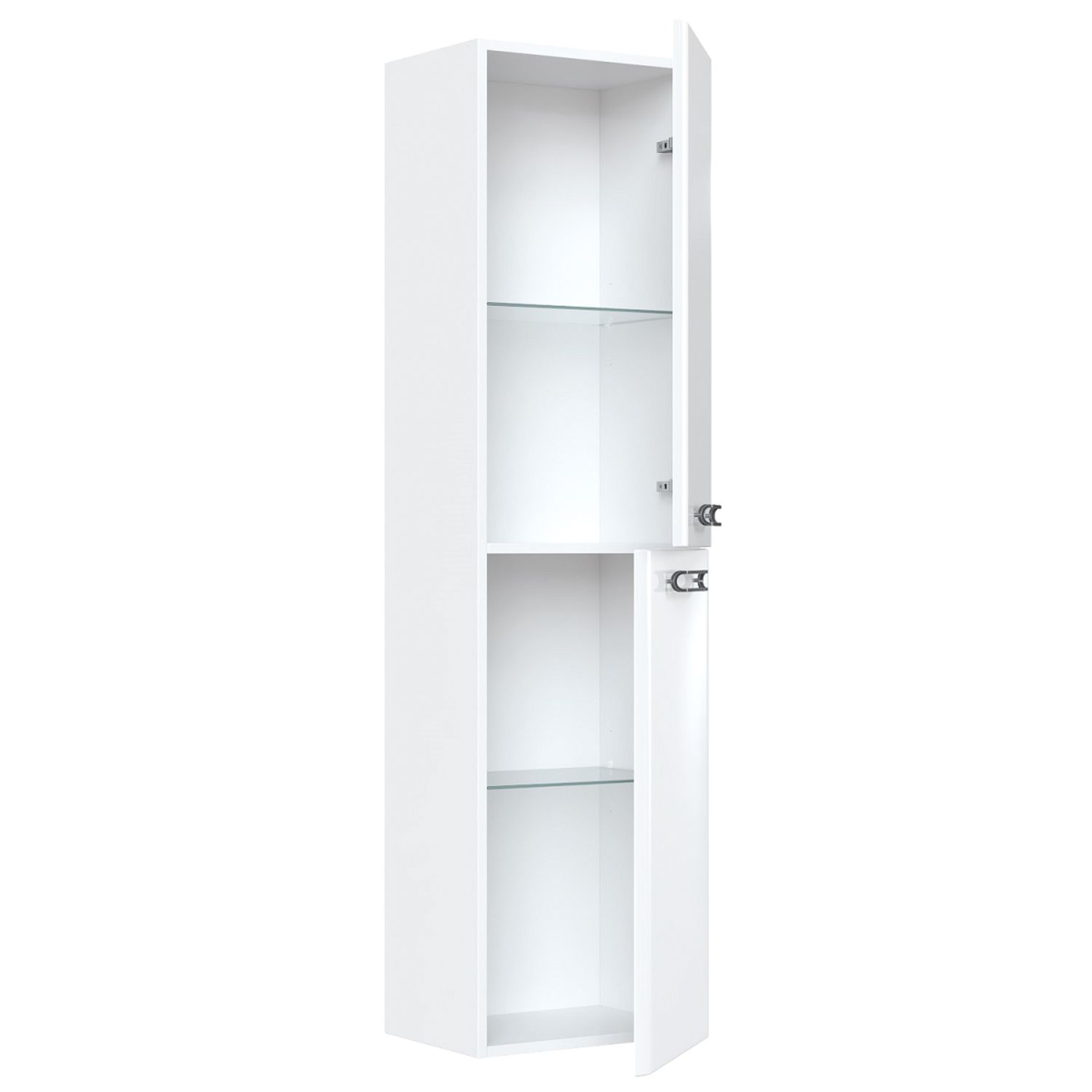Пенал для ванной комнаты, подвесной. Размеры: 300х400х1500 мм (ДхШхВ). Универсальная ориентация. Фасады МДФ 19 мм в эмали (цвет белый глянец). Корпус влагостойкий ЛДСП 16 мм в эмали. Две дверцы. Ручки - цвет состаренное олово. Стеклянные полки 4 мм с фиксаторами. Петли с доводчиками. Упаковка: картон, пленка, пенопластовые уголки.