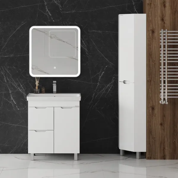 Пенал имеет два отделения за распашными дверцами с доводчиками, полки внутри регулируются по высоте. Ручки, изящно интегрированные в фасады, позволяют сделать эксплуатацию мебели более удобной и практичной.