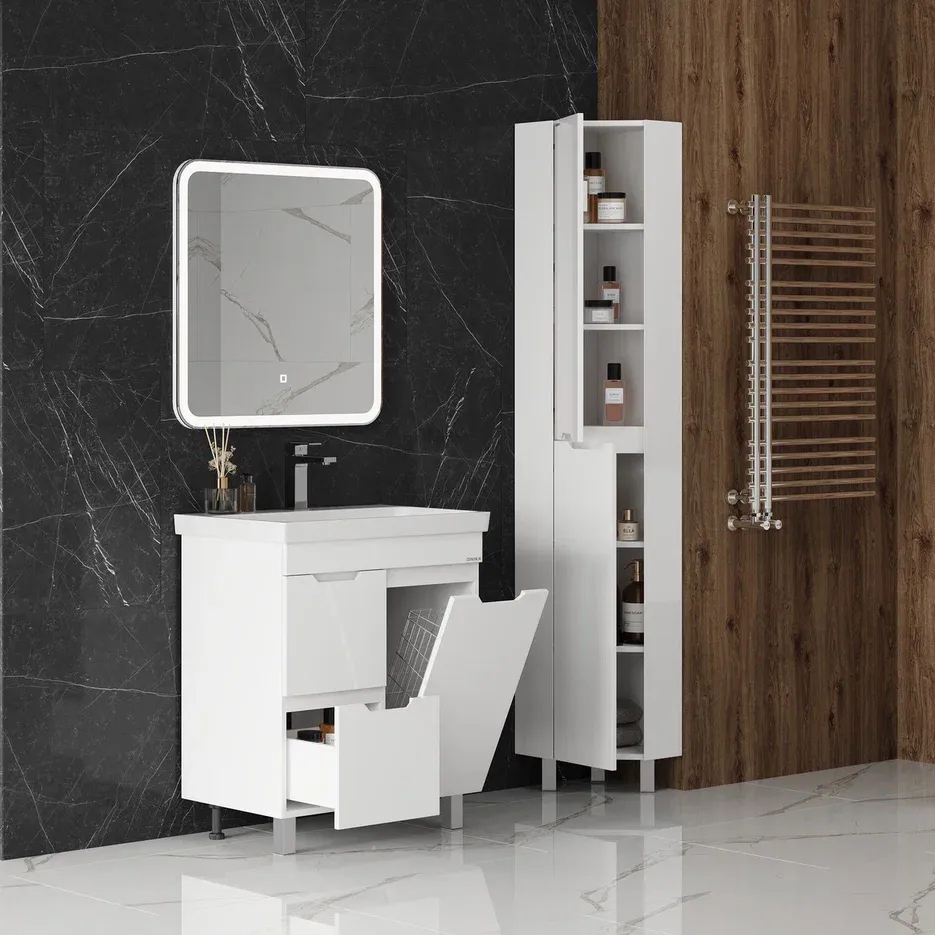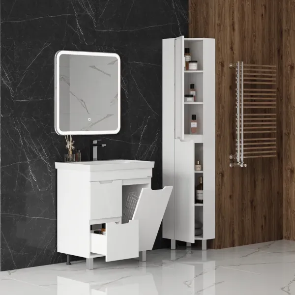 Напольный угловой шкаф пенал с зеркалом для ванной комнаты Айленд 30 сочетает в себе стильный минималистичный дизайн, белую глянцевую поверхность и высочайшее качество исполнения.