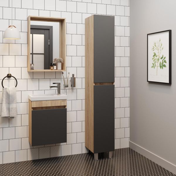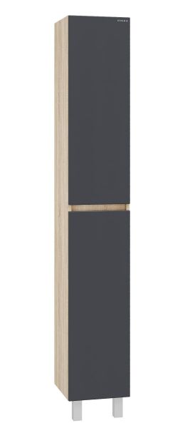 Напольный пенал для ванной комнаты Onika Милтон 30 сочетает в себе контрастные цвета и фактуры: серый матовый фасад с покрытием SoftTouch прекрасно гармонирует с корпусом цвета дуб сонома с роскошной текстурой.