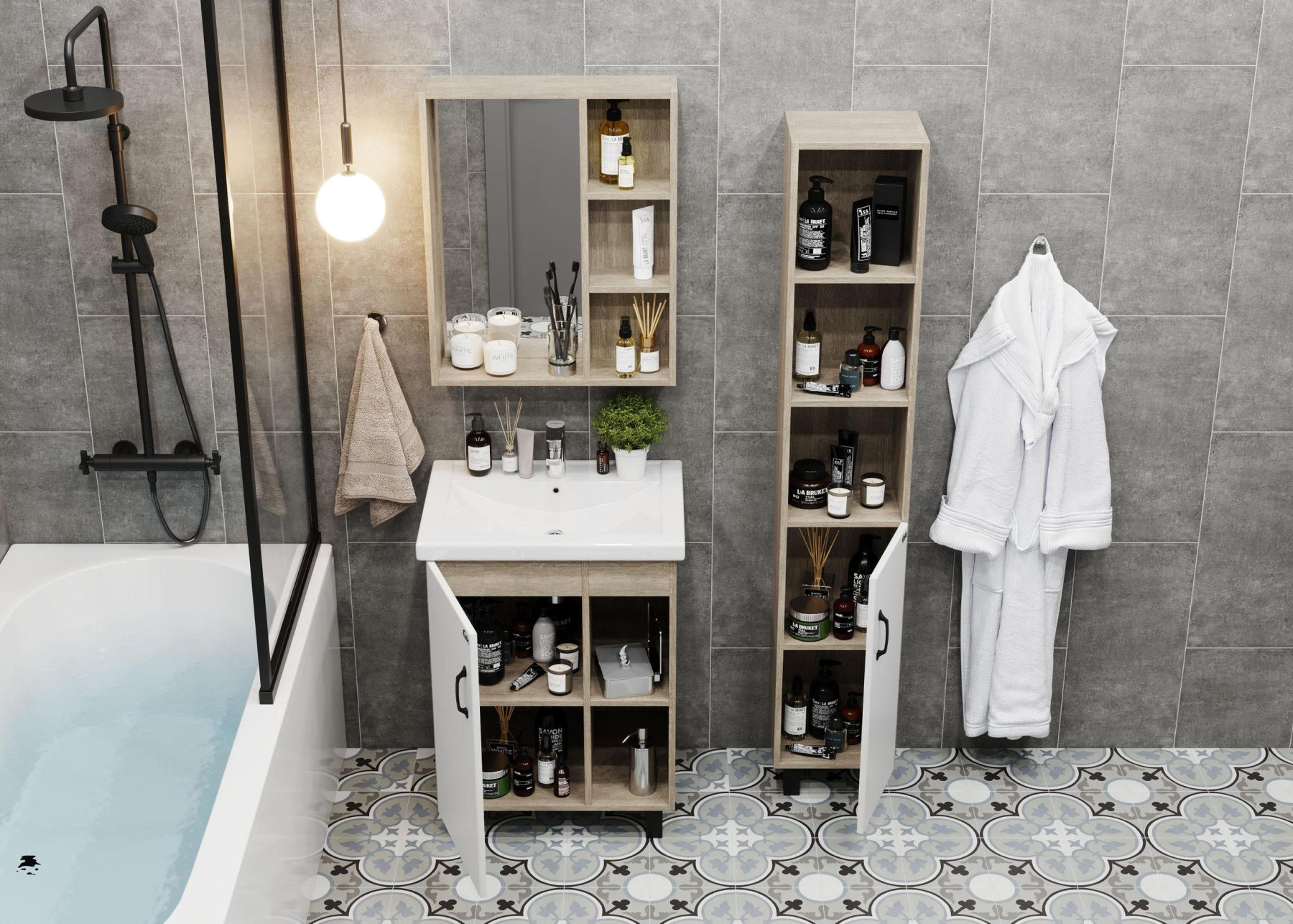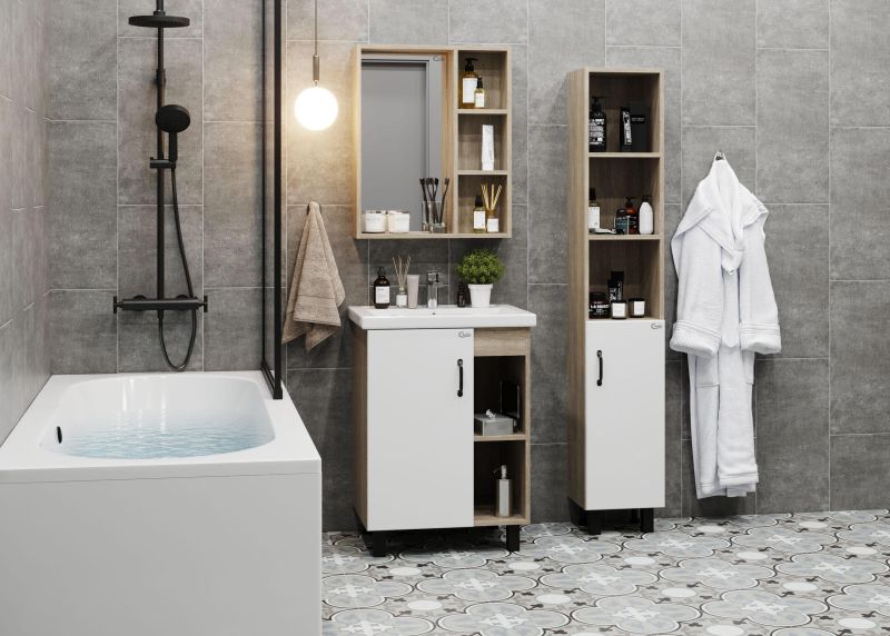 Напольный пенал для ванной комнаты пенал Onika ТИМБЕР 30 удачно сочетает в себе контрастные цвета и фактуры: белый матовый фасад с покрытием SoftTouch, корпус цвета дуб сонома с роскошной текстурой, черная матовая металлическая фурнитура.
