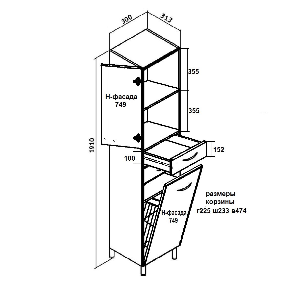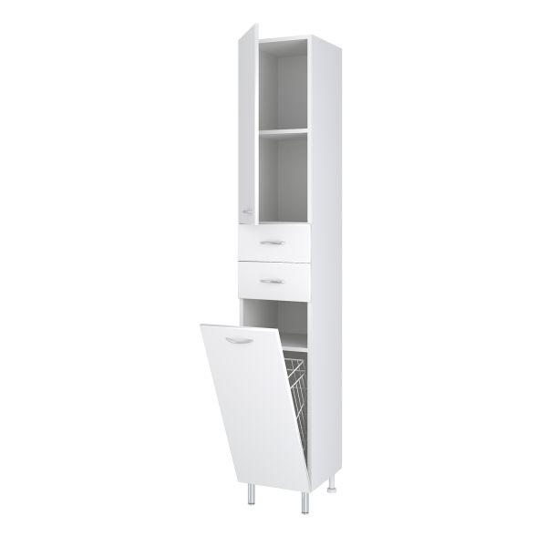 Шкаф-колонна напольный с двумя отделениями и выдвижными ящиками. Верхнее отделение с распашной дверкой и одной внутренней полкой. Нижнее отделение - с откидной дверью. Комплектуется полкой и корзиной для белья. Ящики - на шариковых направляющих, петли со встроенным доводчиком, ручки - 4 шт, ножки хром - 2 шт, ножки пластик -2шт.