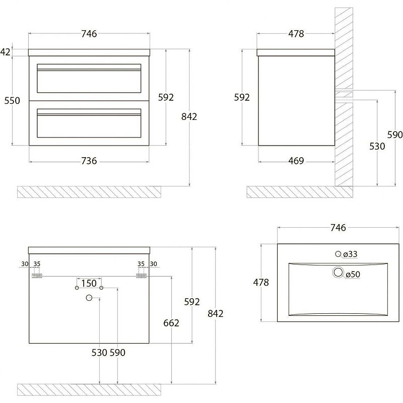 - Рекомендуемая высота от пола: 844 мм