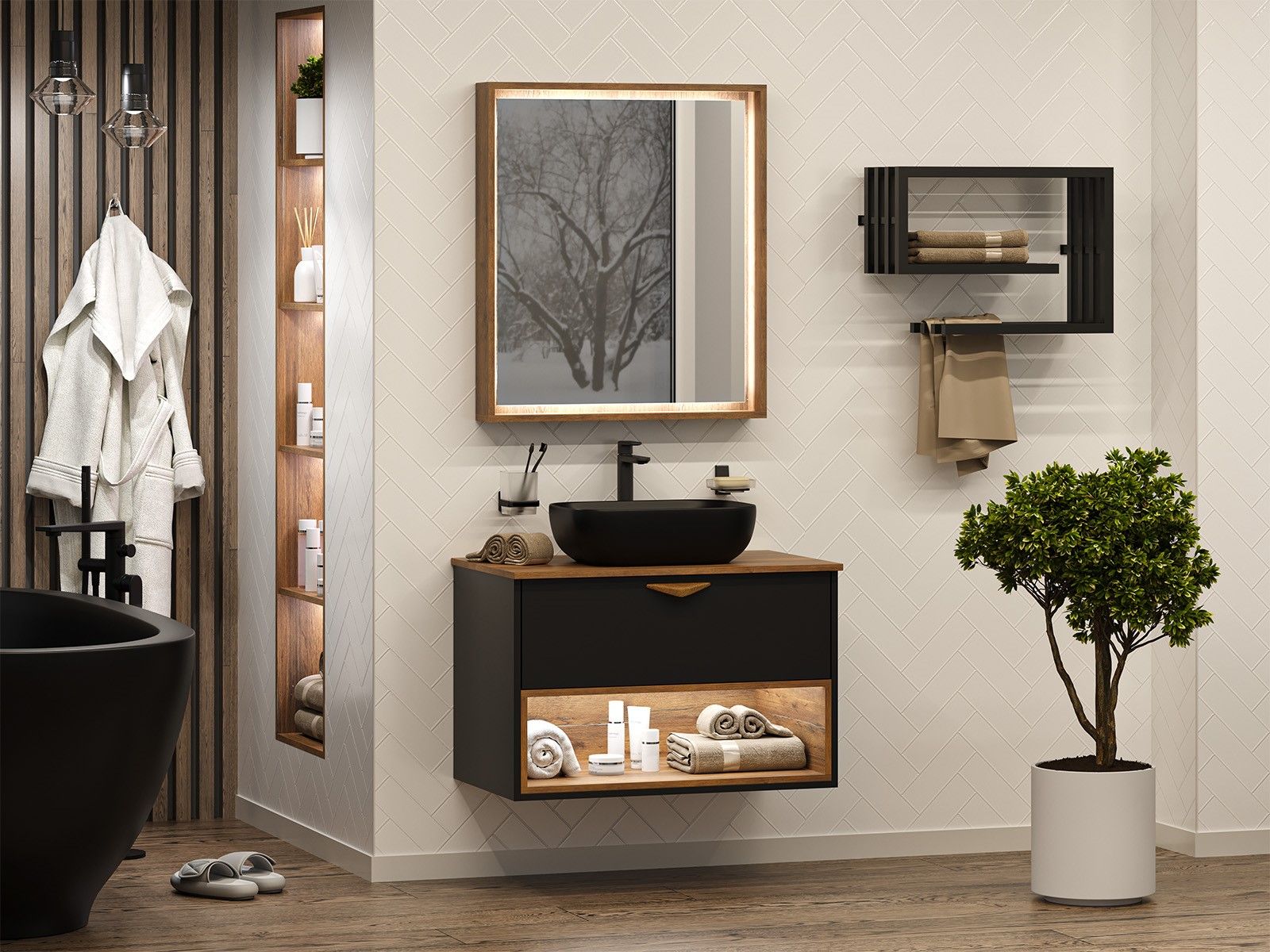 Подвесная тумба под раковину Brevita Bergen BER-07080-19-02-1Я с подсветкой 80см дуб Галифакс олово/чёрный купить
