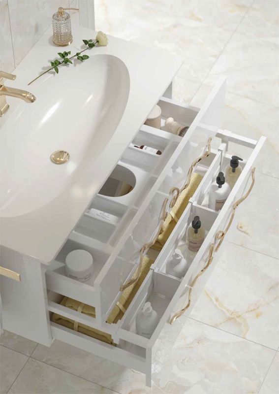 Тумба оснащена механизмами плавного и бесшумного закрытия, направляющими скрытого монтажа.