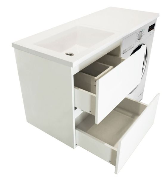 Коллекция мебели для ванной комнаты Dallas Luxe покоряет своей удивительной простой и функциональностью. Современная тумба укомплектована раковиной из литьевого мрамора с удобной чашей. Стиральная машина устанавливается под столешницей, за счет чего экономит место в ванной комнате. В тумбе имеются два ящика. Нижний ящик тумбы – широкий и вместительный – предназначен для крупных предметов, а в верхнем имеется специальная организация пространства, позволяющая хранить мелкие вещи. Подвесная система монтажа позволяет более эффективно использовать пространство, не мешает уборке в ванной комнате.