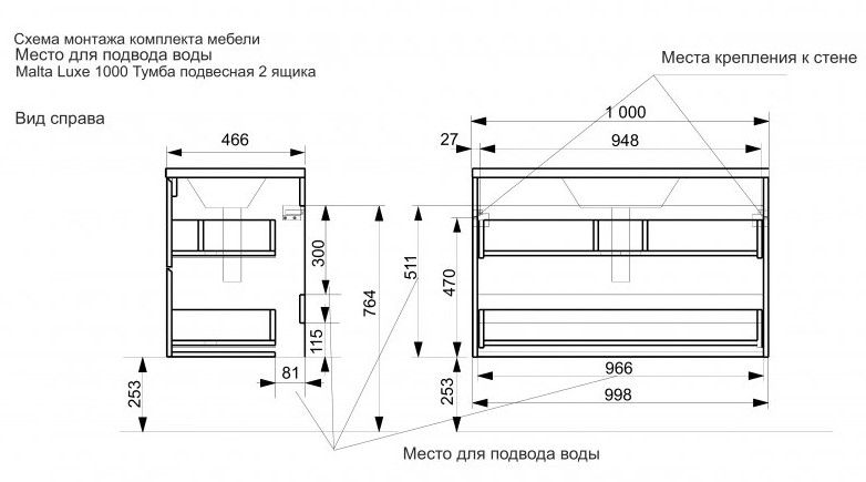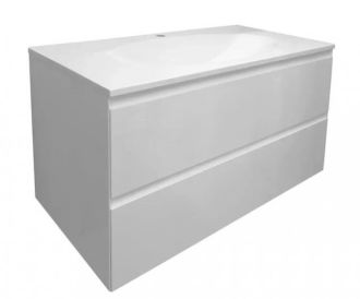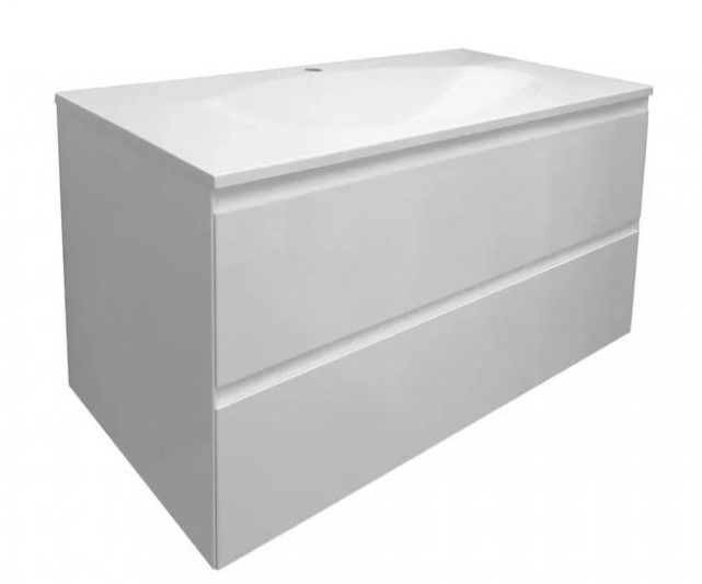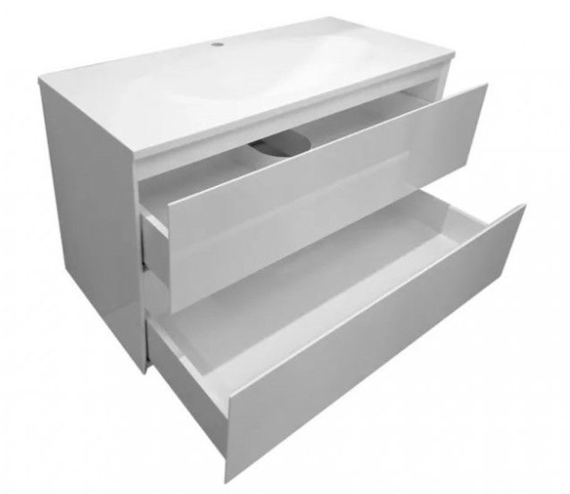 В тумбе расположены 2 вместительных ящика, интегрированные ручки выполнены за счет скошенных фасадов. Мебель выполнена из влагостойкого ЛДСП и качественного MDF с использованием эмали RENNER (Италия). Ящики снабжены системой плавного закрывания. Для мебели используется фурнитура Samet (Турция).