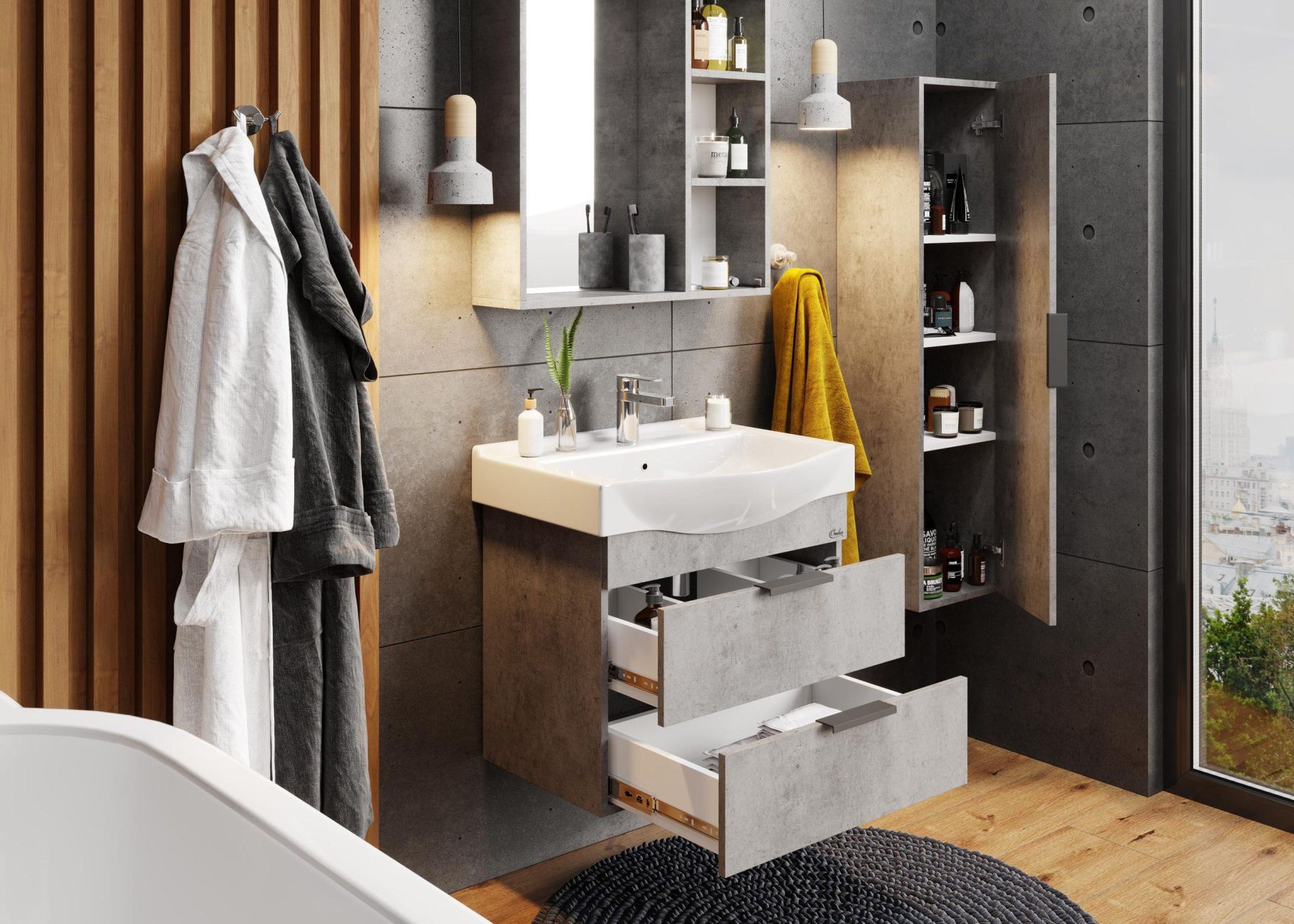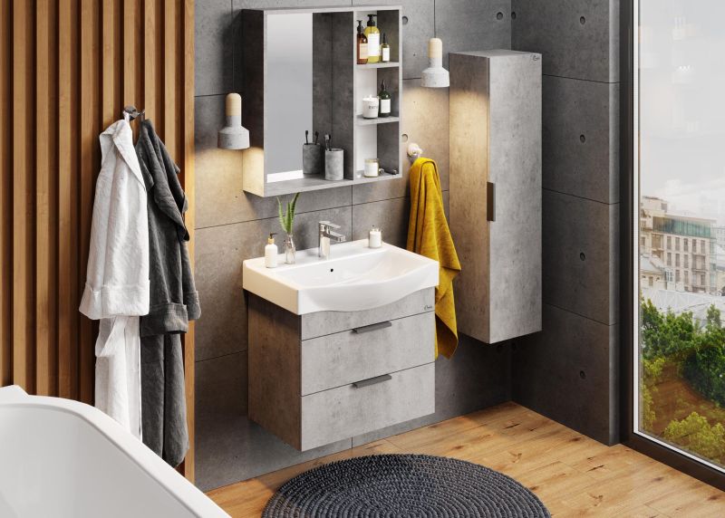 Подвесная тумба для ванной комнаты Onika Девис 65 отличается чёткой геометрией форм и создана для тех, кто ценит современный лаконичный дизайн, холодный брутальный эффект бетона, а также безупречное исполнение.