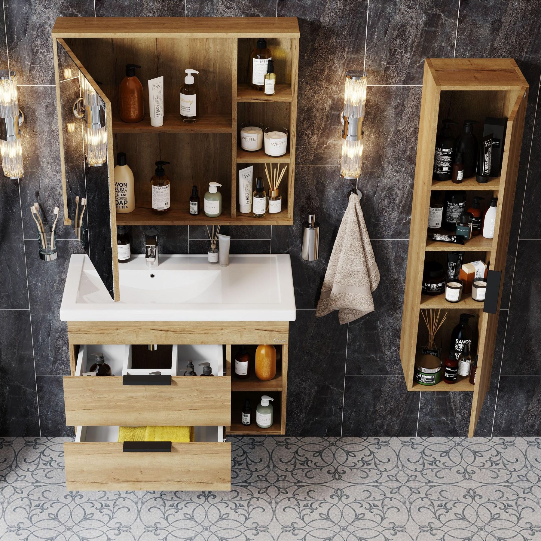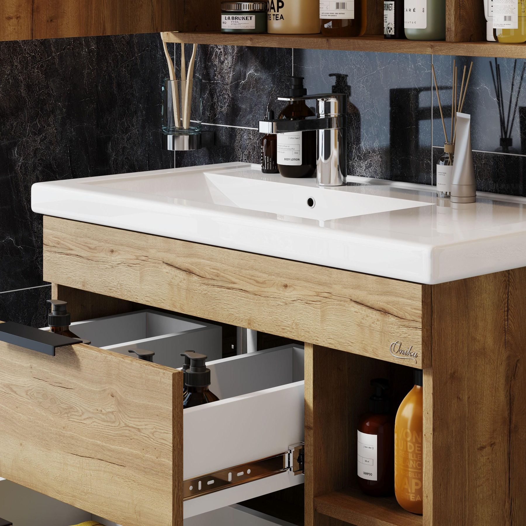 Подвесная тумба для ванной комнаты Onika Легран 80 - это сочетание насыщенного древесного декора и благородства металла: роскошная текстура и натуральный цвет дуба дают теплоту, а матовые металлические ручки добавляют урбанизма и солидности.