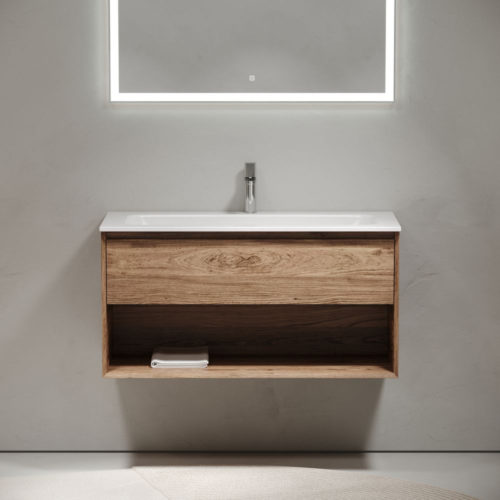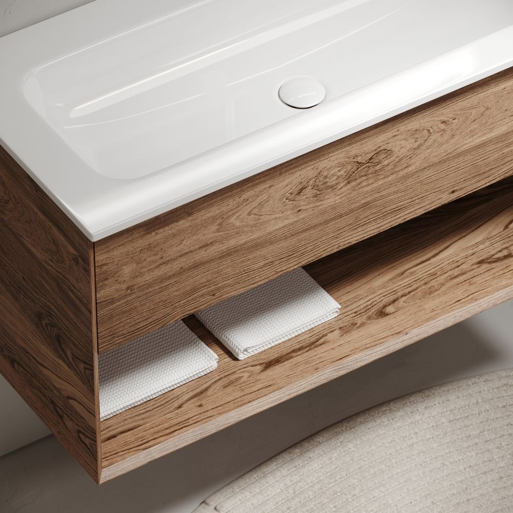 Тумба подвесная SANCOS Marmi 1.0 995х445х520 c одним ящиком оснащенным доводчиками скрытого монтажа с системой Soft close (плавного закрывания) и открытой нишей, c фрезерованной ручкой по всей длине фасада, дуб чарльстон, арт.MR1.0100ECH