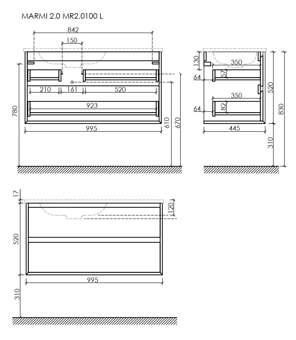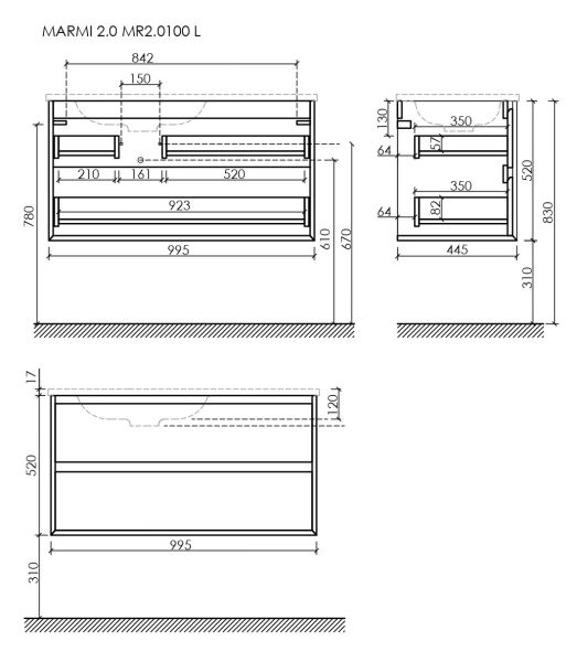 Тумба подвесная SANCOS Marmi 2.0 левая, 995х445х520, c двумя ящиками оснащенными доводчиками скрытого монтажа с системой Soft close (плавного закрывания), c фрезерованными ручками по всей длине фасада, цвет дуб галифакс натуральный, арт. MR2.0100LEG