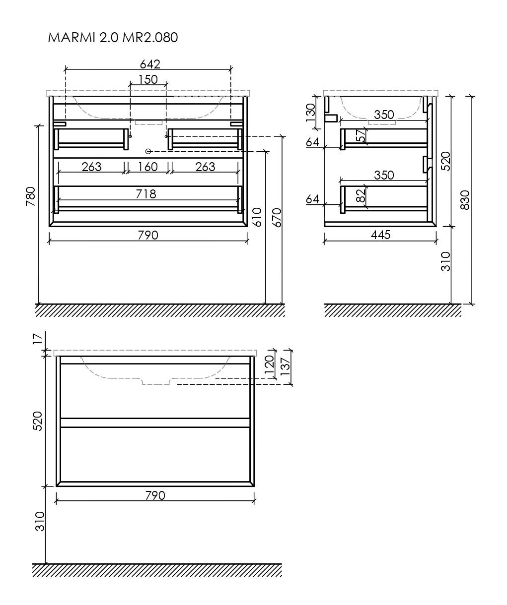Тумба подвесная SANCOS Marmi 2.0 790х445х520 c двумя ящиками оснащенными доводчиками скрытого монтажа с системой Soft close (плавного закрывания), c фрезерованными ручками по всей длине фасада, цвет дуб галифакс натуральный, арт. MR2.080EG