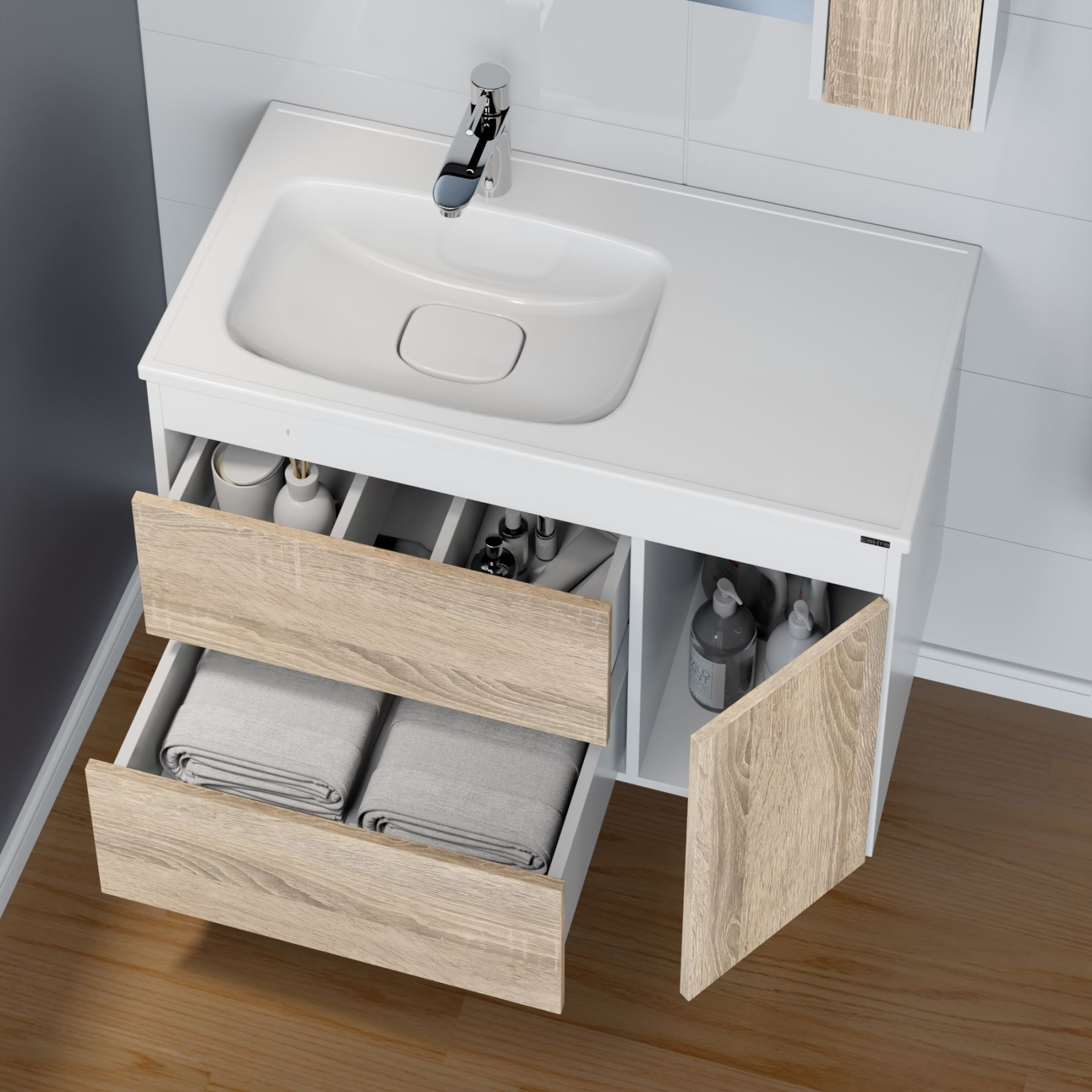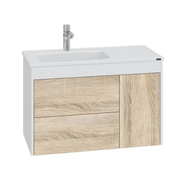 Подвесная тумба Меркурий 90 под умывальник Венера 90. Фасады тумбы выполнены из ЛДСП с ламинацией, боковины и верхняя планка покрыты матовой белой эмалью. Выдвижные ящики и дверь открываются с помощью механизма "Push to open" (нажать, что бы открыть), на дверке петли с плавным закрыванием.