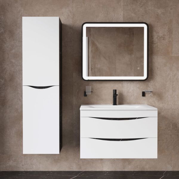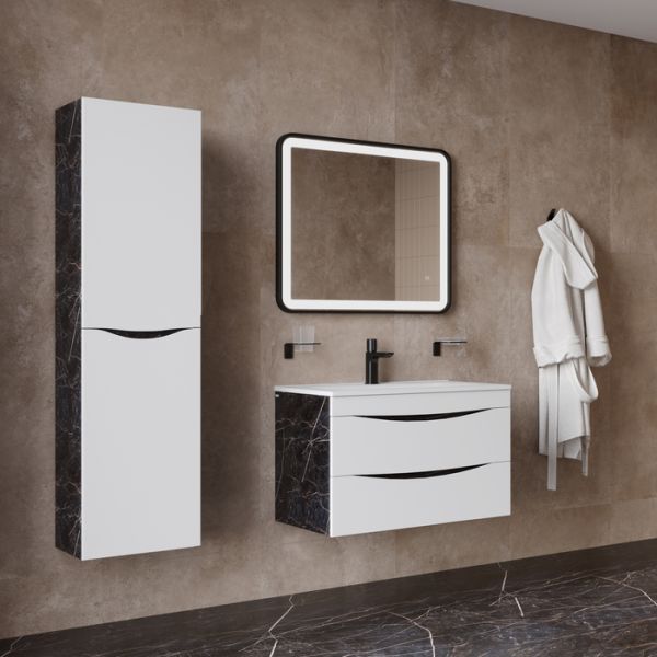Стильная подвесная тумба Cloud из влагостойкой ЛДСП, где гармонично сочетаются боковины под черный мрамор, матовые белые фасады с интегрированными ручками и тонкий умывальник. Обновление популярной коллекции мебели Cloud и украшение современной ванной.