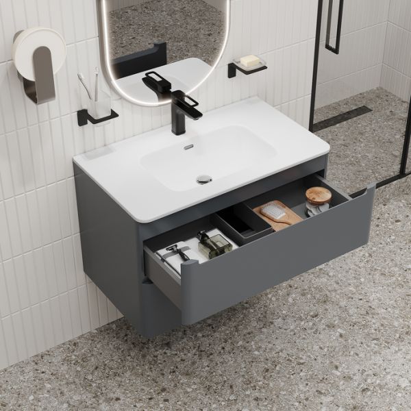 Подвесная тумба с плоским умывальником Edifice стильного темно-серого цвета – воплощение современного минимализма. Мягкие линии корпуса в сочетании с удобными интегрированными ручками выглядят свежо и актуально. Смотрится аккуратно, легко и не усложняет процесс уборки в ванной благодаря подвесной конструкции.