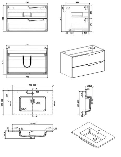 Подвесная тумба с раковиной Parly Spa Rhea80 чёрный матовый