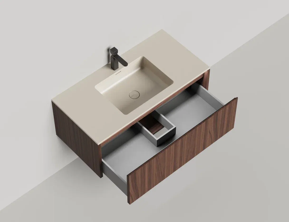 - Тумба и столешница из материала S-Stone в сборе (накладные раковины укомплектованы донным клапаном и поставляются в отдельной коробке)