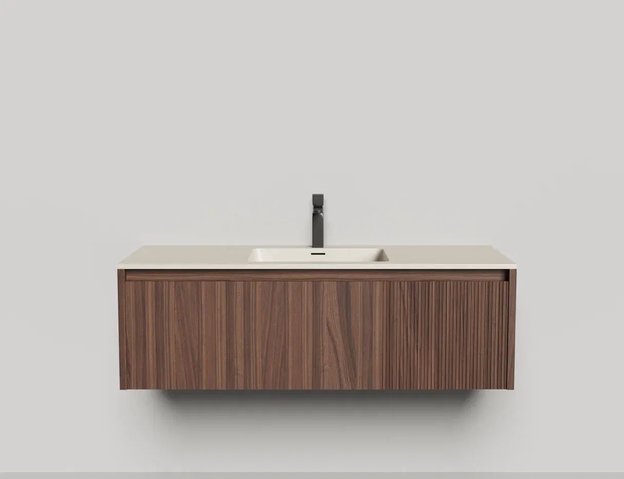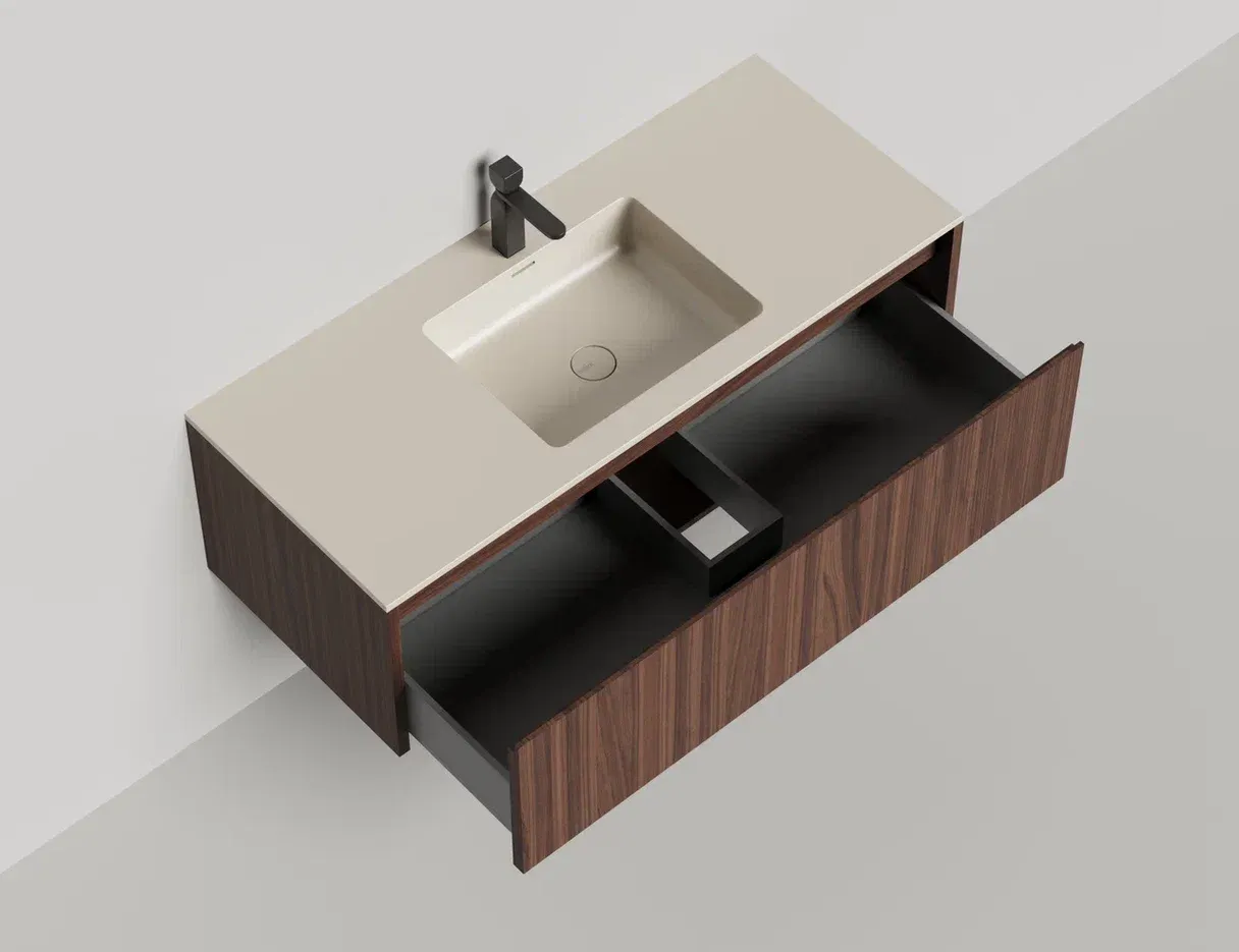 - Тумба и столешница из материала S-Stone в сборе (накладные раковины укомплектованы донным клапаном и поставляются в отдельной коробке)