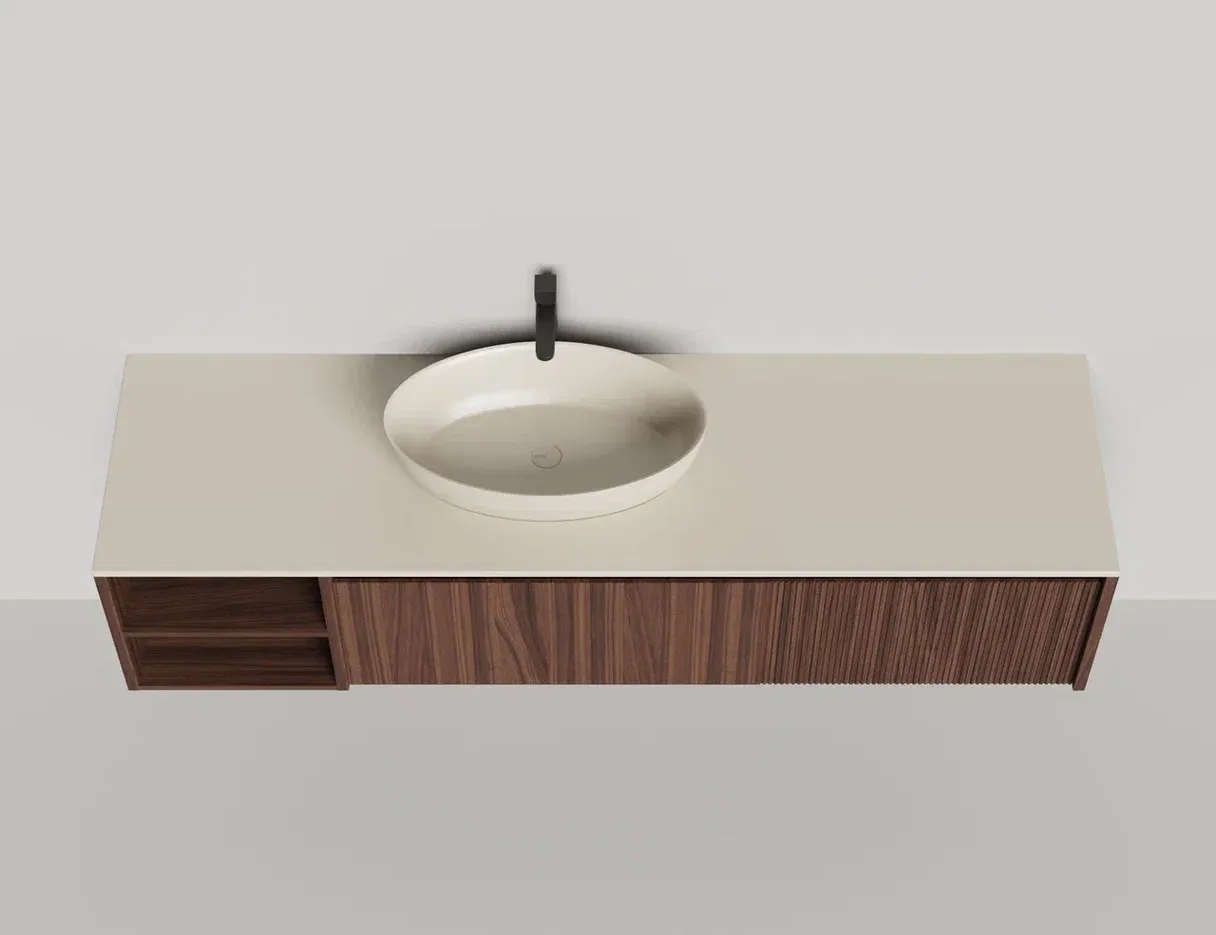 - Тумба и столешница из материала S-Stone в сборе (накладные раковины укомплектованы донным клапаном и поставляются в отдельной коробке)