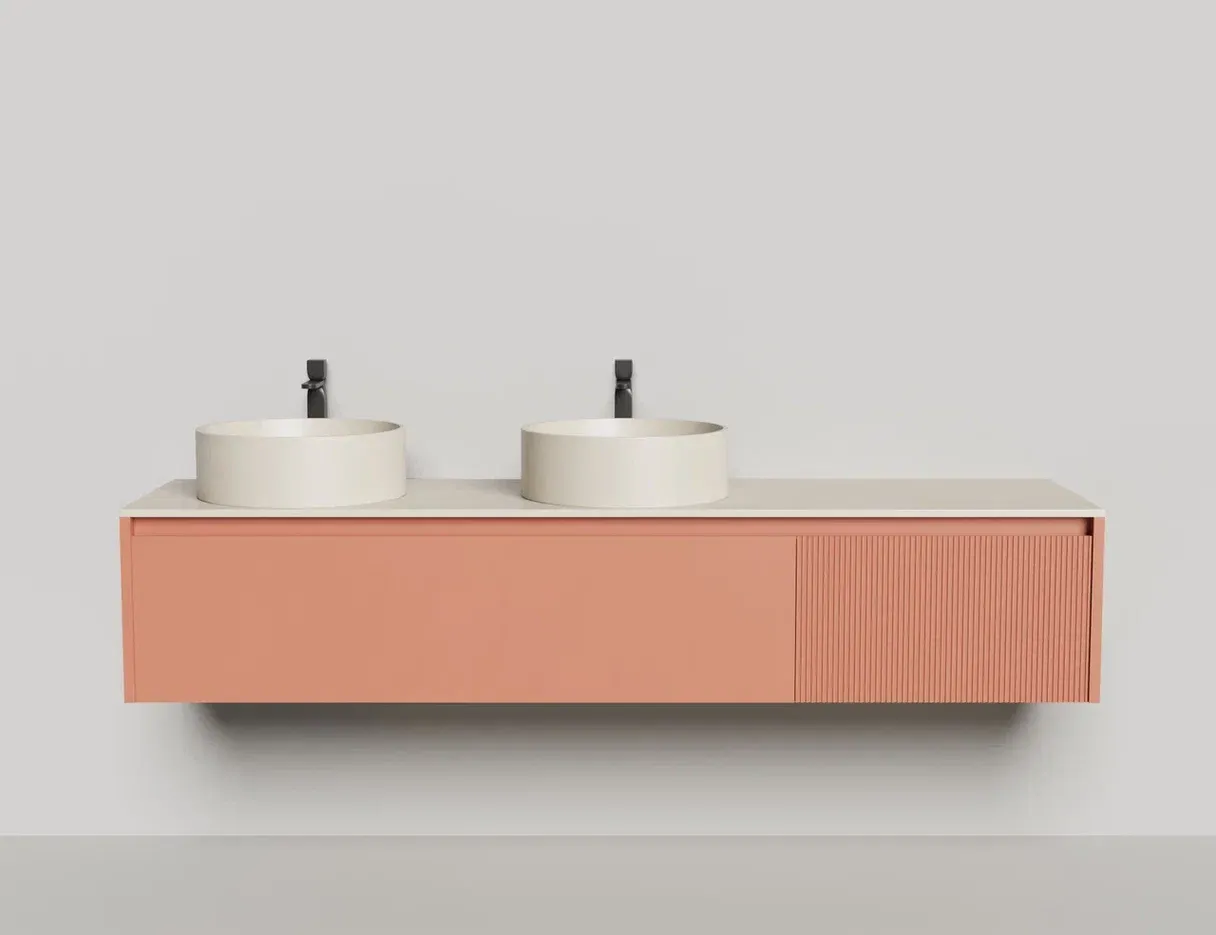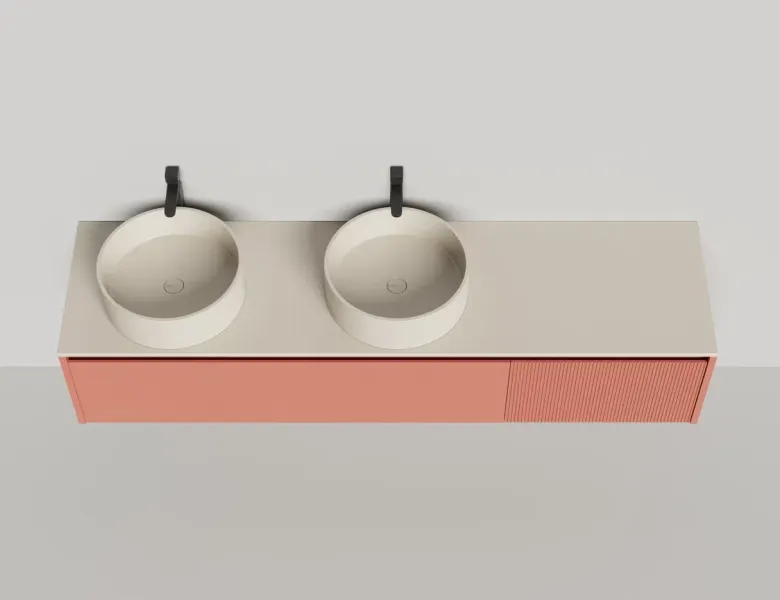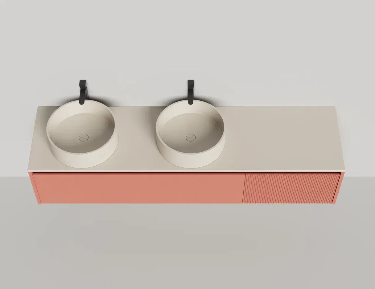 • Тумба и столешница из материала S-Stone в сборе (накладные раковины укомплектованы донным клапаном и поставляются в отдельной коробке)