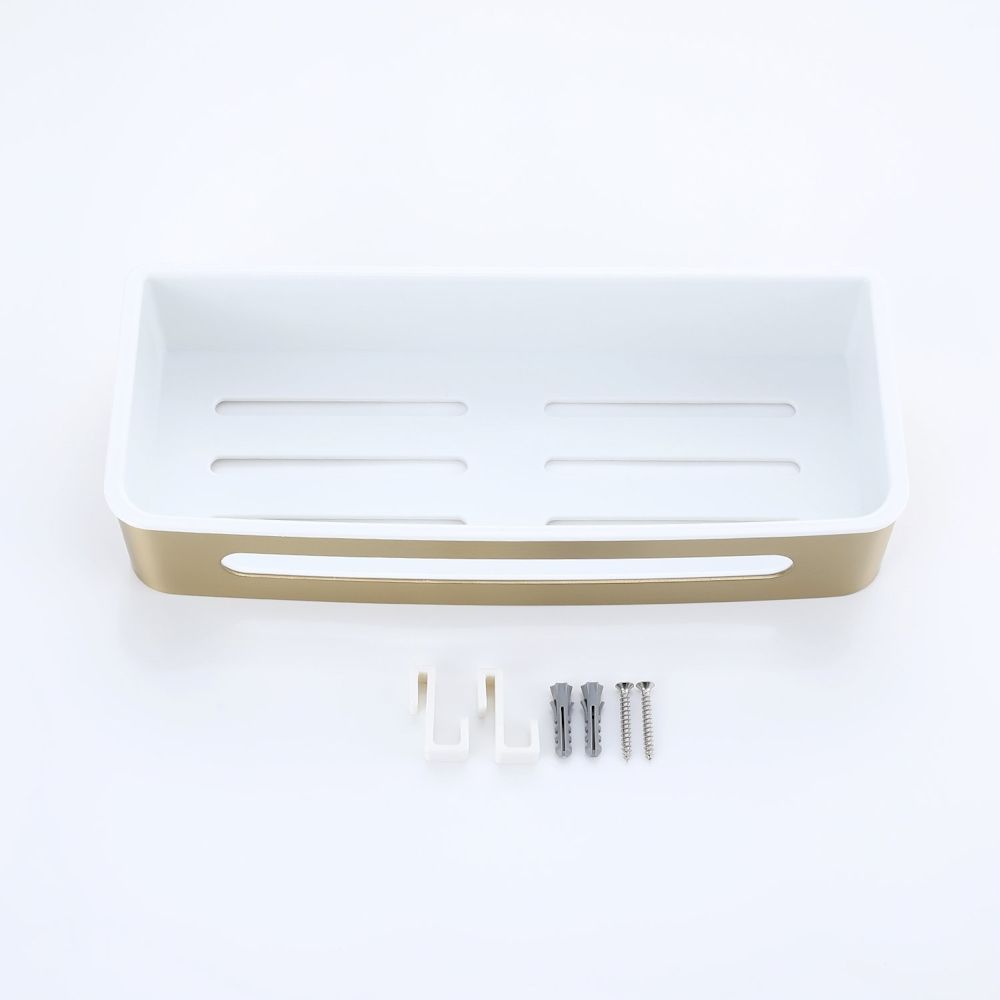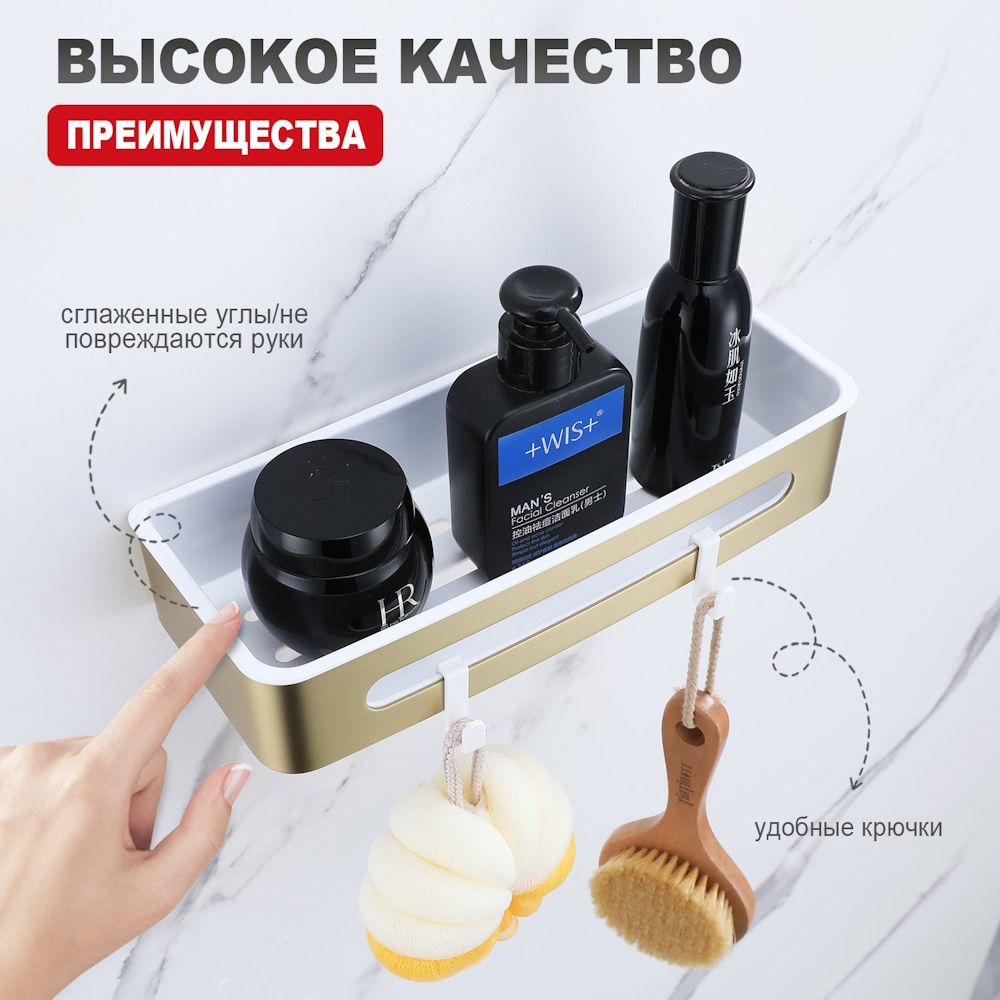 Полка для ванной комнаты Raglo R340.02.03, золотой сатин. Размер: 30x13x6,5 см. Тип крепления: на болтах. Материал: нержавеющая сталь, авс-пластик