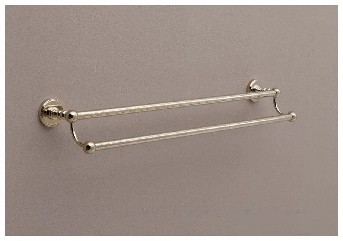 Держатель для полотенец Aquanet 4624D (60 см, двухрядный) - стильный аксессуар в золотой огранке. Ярким элементом в нем является живописная с точеными линиями деталь, которая с одной стороны является держателем для других составляющих модели, с другой – местом, в котором прячутся все крепления аксессуара к стене. Элемент, начинающийся с круглого основания, словно нанизывая на себя детали разных форм, завершается эффектным шаром. В данной модели таких элемента два и они выполняют роль держателя штанги для полотенец длиной 60 см. Кроме того, к ним крепится еще два держателя с шарообразными элементами, сквозь которые в свою очередь продета еще одна штанга длиной 60 см. Соответственно, аксессуар рассчитан на размещение двух полотенец. Для крепления к стене предусмотрена надежная система, скрытая от глаз в декоративных элементах.