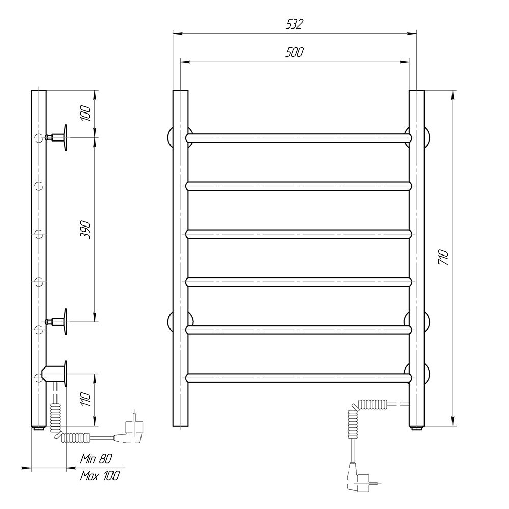 М/о расстояние (межосевое расстояние): 500Количество перекладин: 6Коллекция: АврораТип: электрическиеЦвет: черныйМощность, Вт: 70Ширина (мм): 532Высота (мм): 710Глубина (мм): 80-100Вес: 3,9Объем: 0,0418Тэн/подключение: справаСтрана: РоссияГарантия: 2 года
