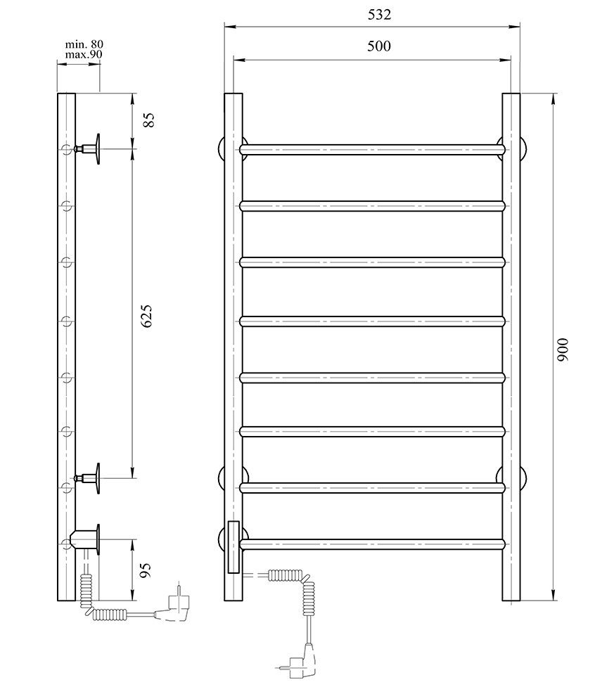 М/о расстояние (межосевое расстояние): 500Количество перекладин: 8Коллекция: АврораТип: электрическиеЦвет: хромМощность, Вт: 300Ширина (мм): 532Высота (мм): 900Глубина (мм): 90/80Вес: 5,15Объем: 0,0425Тэн/подключение: слеваСтрана: РоссияГарантия: 2 года